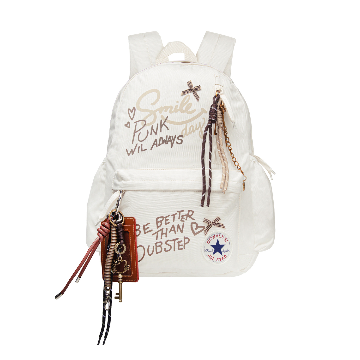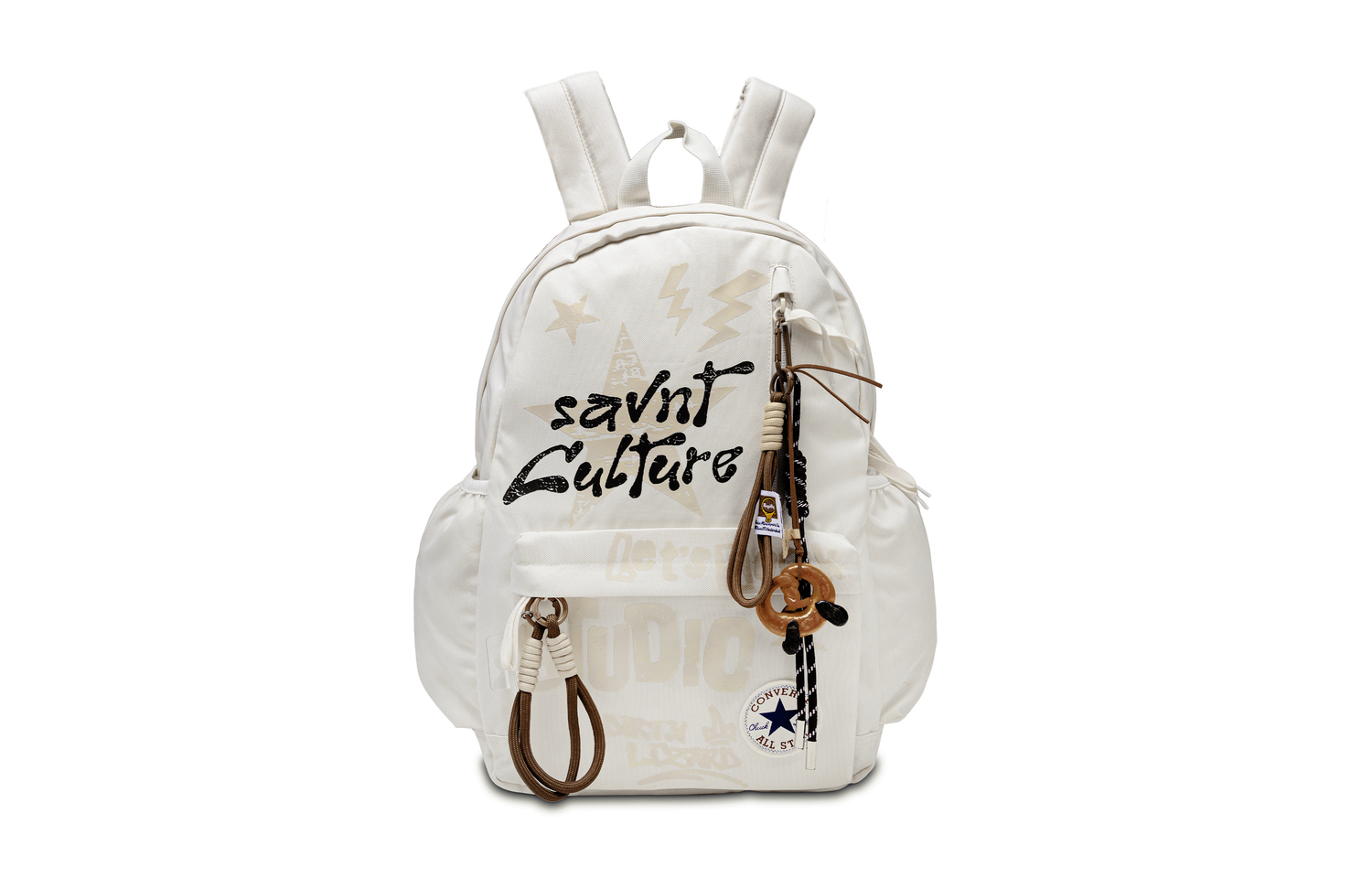 Эта сумка, выполненная по индивидуальному заказу, представляет собой вместительный рюкзак Converse с застежкой-молнией, изготовленный из полиэстерового волокна. Модель среднего размера, унисекс, белого цвета. Дизайн сочетает уличный стиль и ретро-культуру: граффити, например, «savnt Culture», а также элементы в виде молний и звёзд создают непринужденный и непринужденный уличный образ, демонстрируя индивидуальность.