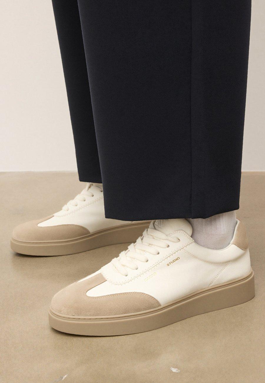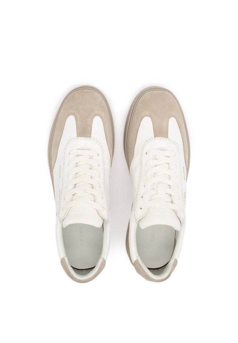 Мужские кроссовки сочетают минимализм с современным силуэтом и роскошными материалами. Гладкая белая натуральная кожа гармонично контрастирует с мягкой серой замшей, которая подчеркивает носок и задник, создавая изысканную игру текстур. Золотистая надпись KAZAR STUDIO ненавязчиво подчеркивает фирменный стиль модели, не нарушая ее чистую форму. На смелой бежевой подошве с легким профилем кроссовки приобретают современный уличный стиль, сохраняя при этом полную функциональность и комфорт. Это модель для мужчины, который ценит продуманную архитектуру, качественную отделку и ненавязчивый стиль. Идеально сочетаются с объемным пальто, белой рубашкой и тканевыми брюками - городской стиль, но с душой высокой моды. Подкладка из тонкой и мягкой овчины для максимального комфорта. Носок обуви: круглыйМатериал и уход