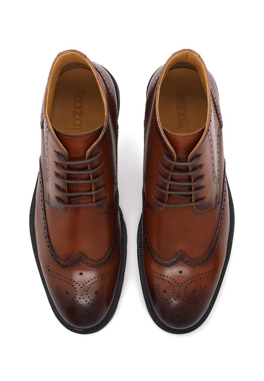 Элегантные ботинки на шнуровке из высококачественной коричневой натуральной кожи со слегка блестящей отделкой. Верх украшен декоративной ажурной отделкой и классической перфорацией, что придает обуви изысканный вид. Модель установлена на прочной, износостойкой подошве с выраженным протектором, обеспечивающей устойчивость и комфорт даже в суровых условиях. Стильное сочетание классической элегантности и современной функциональности делает эти ботинки идеальными как для городского, так и для полуформального стиля. Внутренняя часть обуви, отделанная овчиной, гарантирует гигиеничность и высокий комфорт при ношении. Носок: круглыйМатериал и уход