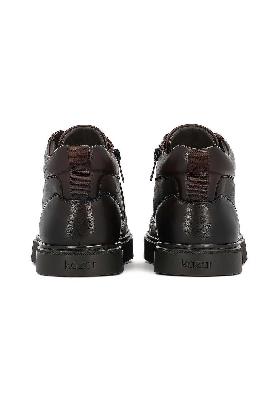 Мужские кроссовки из высококачественной натуральной кожи элегантного коричневого оттенка. Модель отличается высокой шнуровкой, обеспечивающей устойчивость, комфорт и стильный вид. Тонкая прострочка и минималистичные детали подчеркивают спортивно-элегантный характер обуви. Прочная резиновая подошва гарантирует отличную амортизацию и комфорт при повседневной носке. Идеальный выбор для мужчин, ищущих универсальные кроссовки, которые идеально подойдут для городского стиля. Внутренняя часть обуви, отделанная овчиной, гарантирует гигиеничность и высокий комфорт. Носок: круглыйМатериал и уход