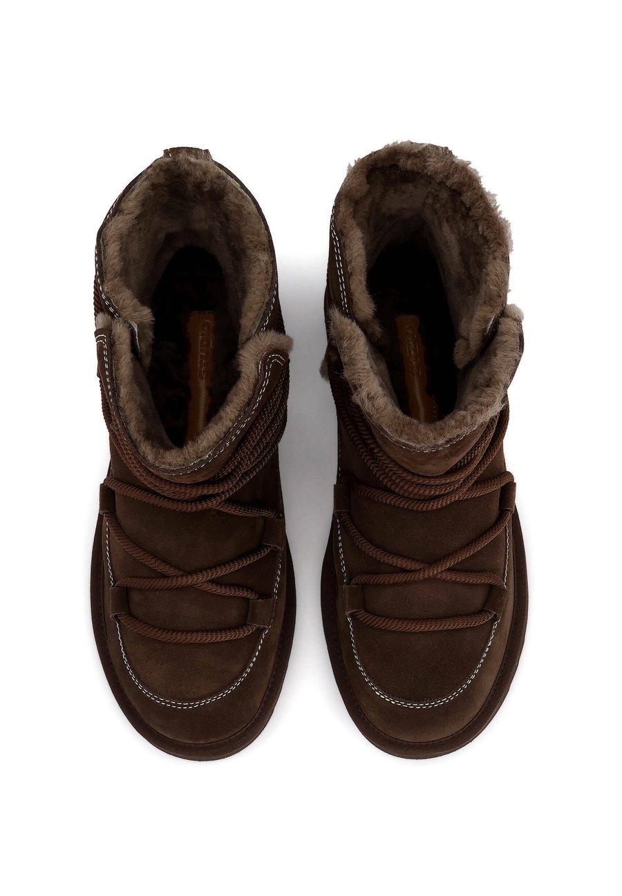 Мужские зимние ботинки теплого коричневого оттенка - отличный выбор для зимних дней, сочетающий функциональность и повседневный стиль. Изготовленные из высококачественной натуральной замши, они дополнены декоративной контрастной строчкой и широкой шнуровкой, что придает им характерный спортивно-туристический вид. Внутренняя часть ботинок полностью отделана мягкой натуральной овечьей шерстью, что обеспечивает тепловой комфорт даже в самые холодные дни. Нескользящая резиновая подошва с протектором гарантирует устойчивость и уверенность при ходьбе. Представленные зимние сапоги - идеальный выбор для мужчин, которые не жертвуют комфортом и стилем даже во время холодных зимних прогулок. Внутренняя часть сапог отделана натуральной овечьей шерстью. Носок: круглыйМатериал и уход