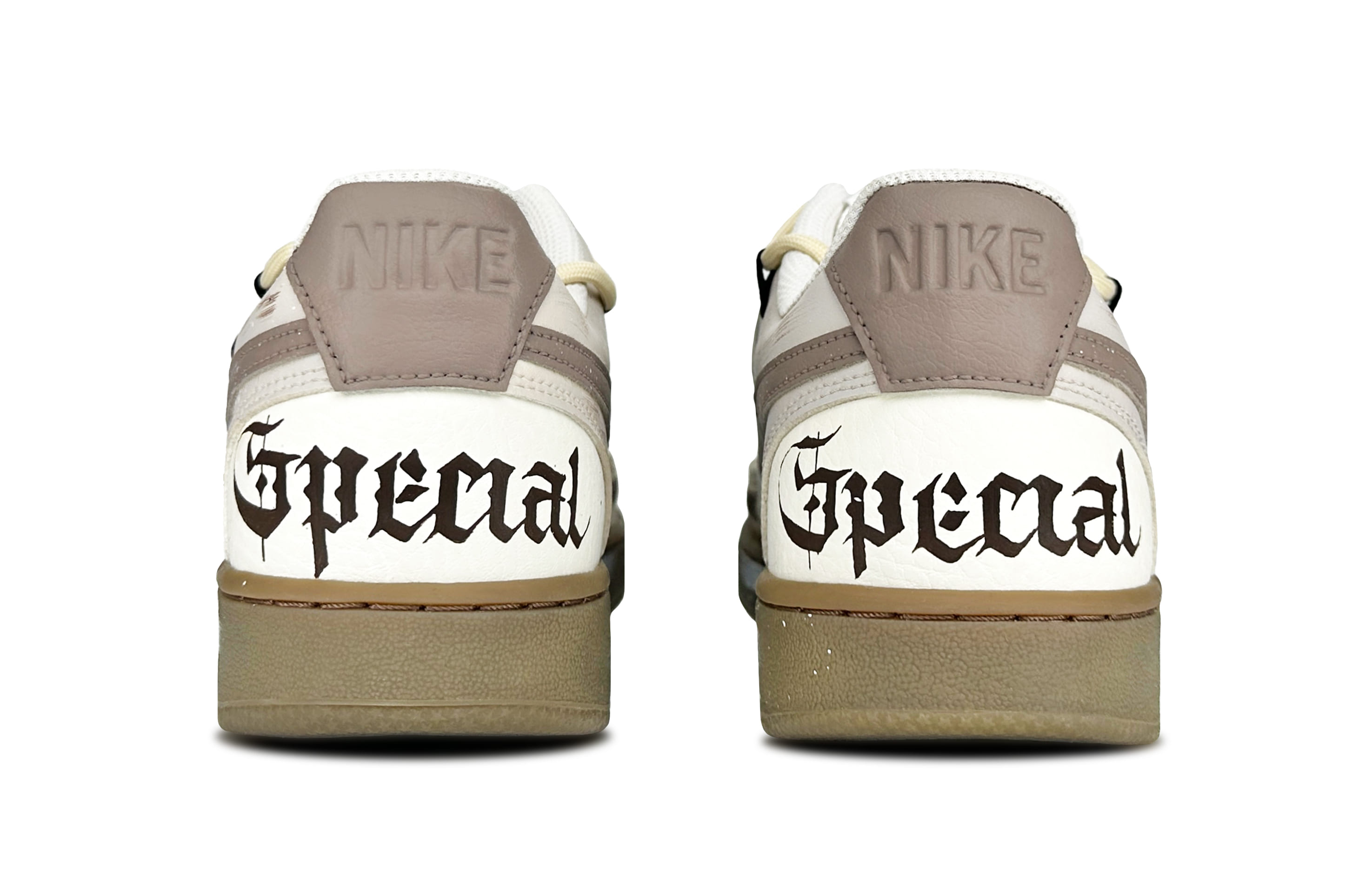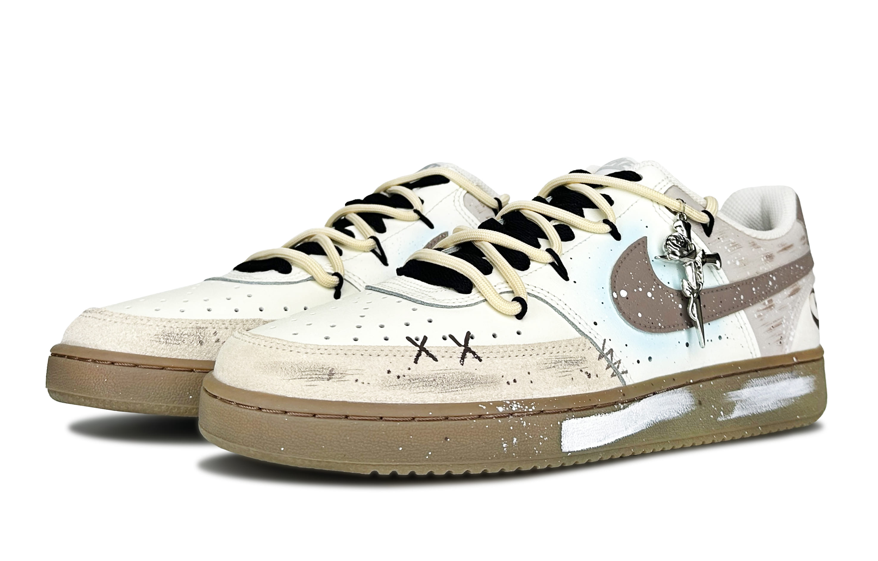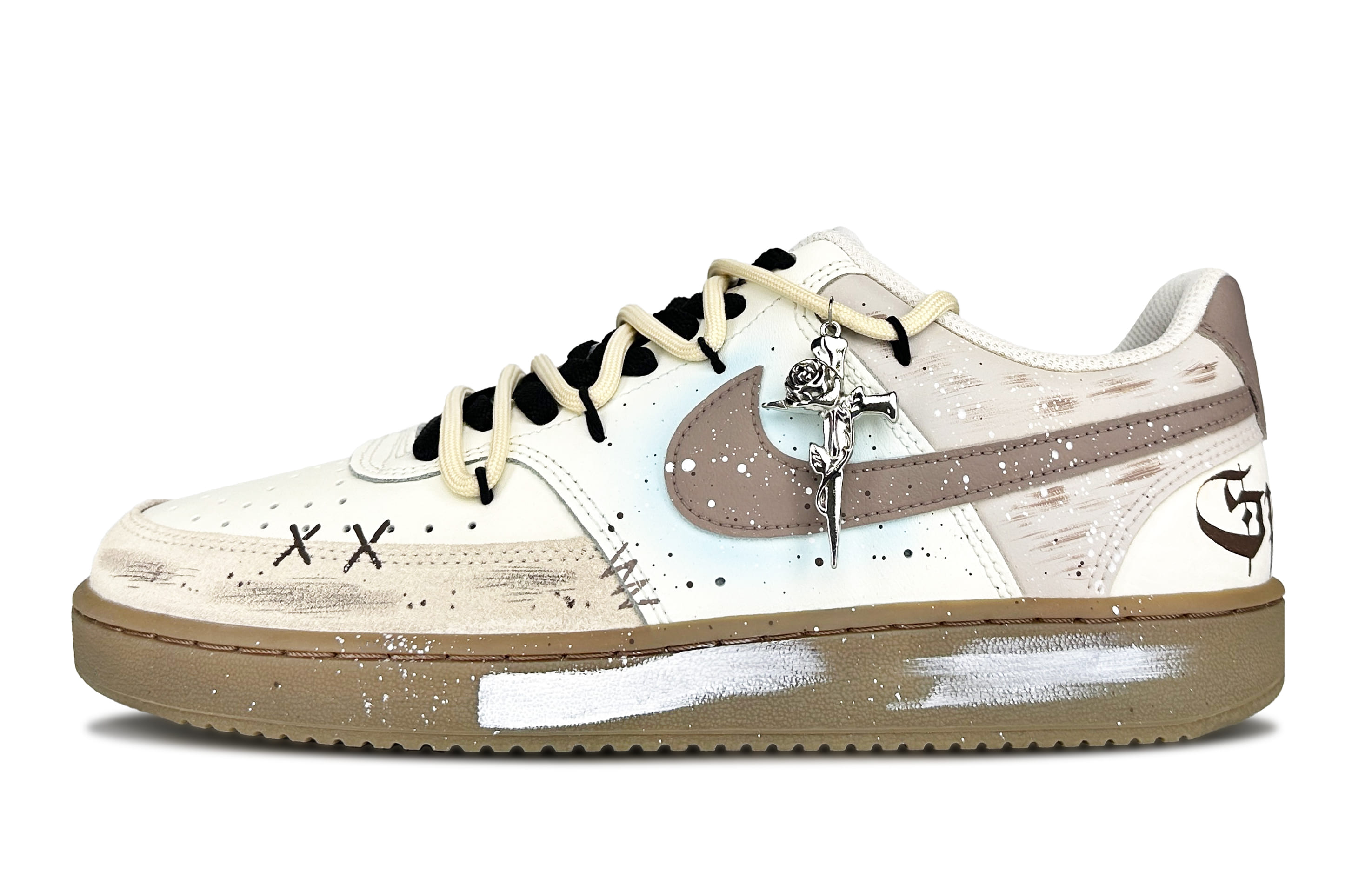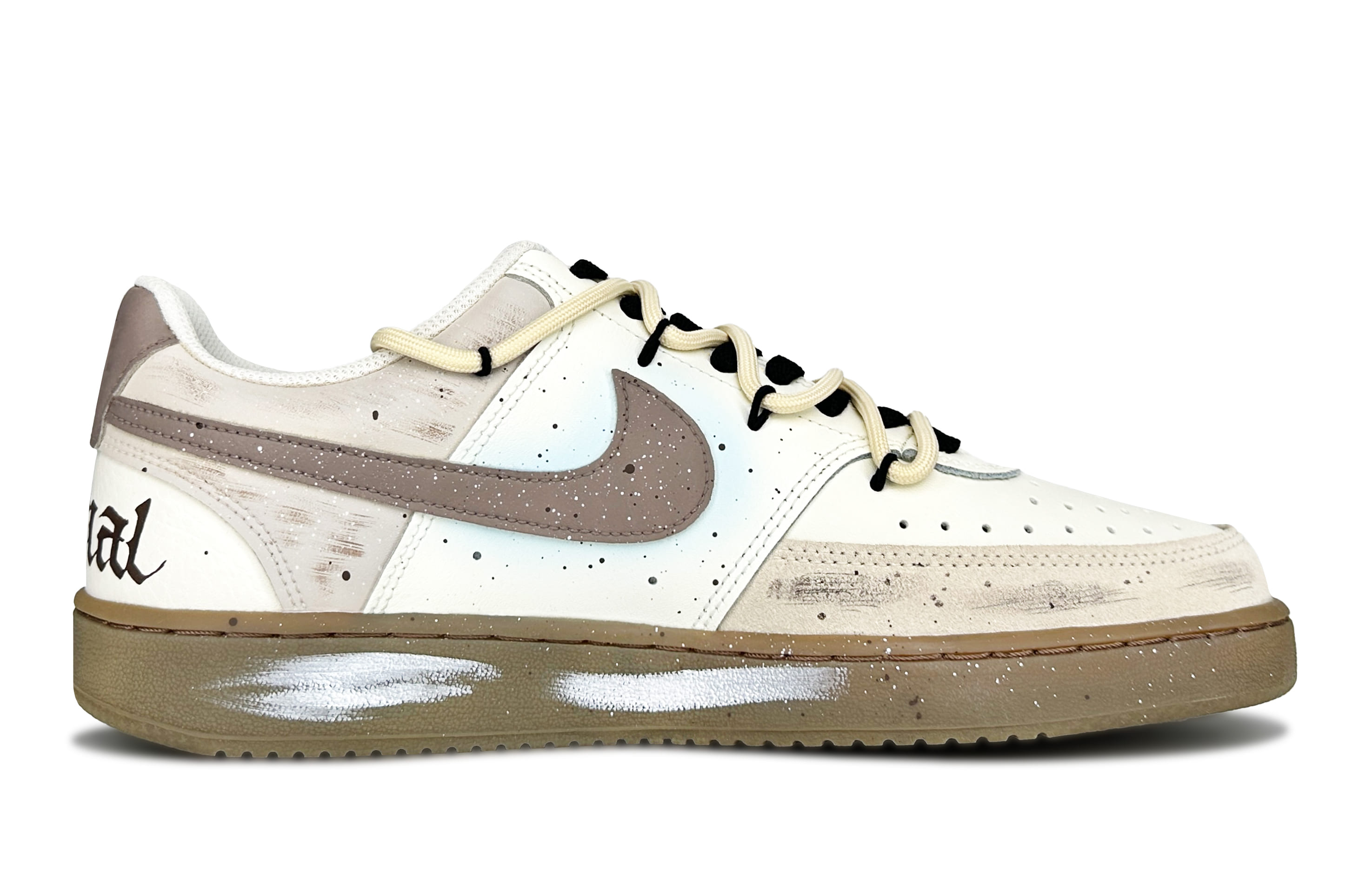 Эти кастомные кроссовки созданы на основе минималистичных, тонких, противоскользящих, прочных низких кроссовок Nike Court Vision Comfort, унисекс, бело-серого цвета. Вдохновленная «переходами света и тени» лунного света, кремовая основа напоминает прозрачную, полупрозрачную текстуру лунного света, а светло-коричневые брызги напоминают пятнистые тени под луной. Состаренная отделка воссоздает ощущение времени, подобно многослойному развитию мелодии между светом и тенью. Металлические украшения напоминают скачущие музыкальные ноты, а строчки символизируют ритмичные паузы. Столкновение ретро-силуэта и авангардных деталей подобно двойному повествованию о лунном свете в классическом и современном контекстах. Общий дизайн направлен на то, чтобы превратить обувь в «поэму под лунным светом», где каждая состаренная деталь и каждый слой цвета являются вариацией на тему личного стиля, играя уникальную эмоциональную мелодию с каждым шагом, интерпретируя личный монолог под лунным светом, балансируя между ретро и авангардом.