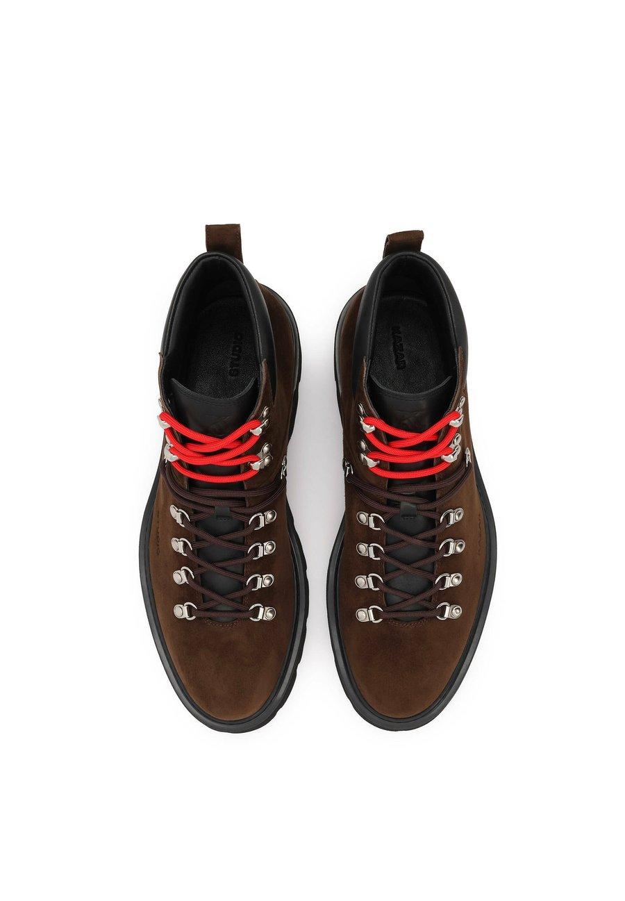 Элегантные мужские ботинки из коричневой замши с контрастной вставкой из гладкой натуральной кожи на воротнике - это современная интерпретация обуви в стиле на открытом воздухе. Шнуровка с использованием металлических крючков и двухцветных черно-красных шнурков подчеркивает их технический характер. Прочная, массивная подошва с глубоким протектором гарантирует устойчивость и комфорт при ношении. Эта модель идеально подходит для осенне-зимнего сезона для мужчины, который ценит сочетание функциональности и модного стиля. Подкладка из мягкой и нежной овчины обеспечивает высочайший уровень комфорта. Носок обуви: круглыйМатериал и уход
