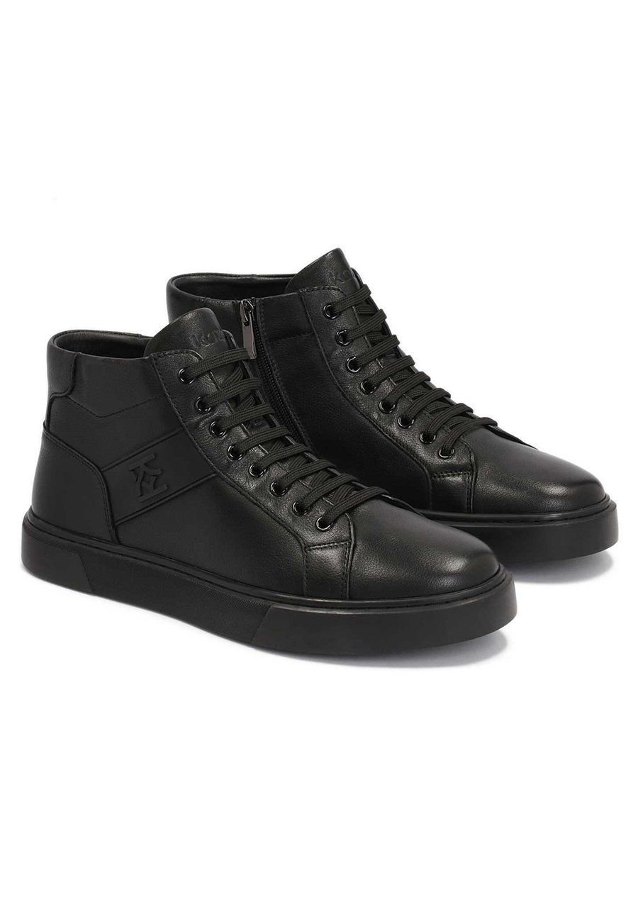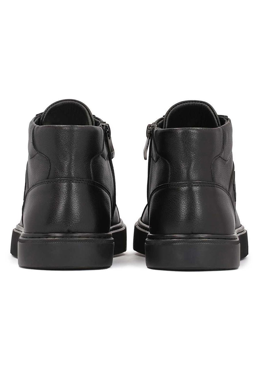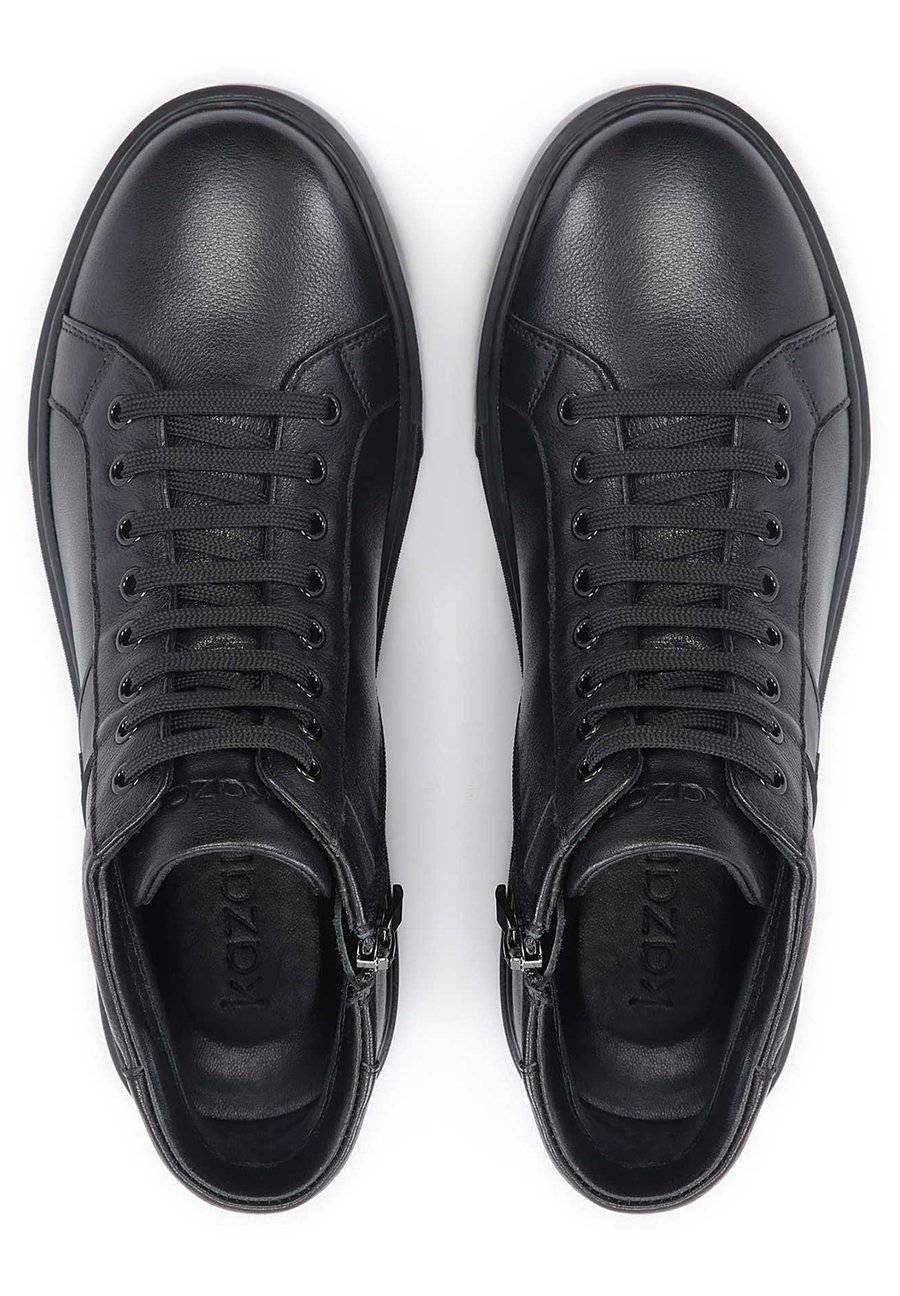 Мужские кроссовки из черной зернистой кожи отличаются минималистичным кроем, продуманным до мелочей. Верхняя часть длиной до щиколотки оснащена системой шнуровки для регулировки по размеру стопы и молнией для дополнительного комфорта при надевании и снимании обуви. Изящный декор в виде монограммы KAZAR выглядит элегантно и стильно. Подкладка из мягкой овечьей кожи обеспечивает исключительный комфорт при ношении. Носок обуви: круглыйМатериал и уход