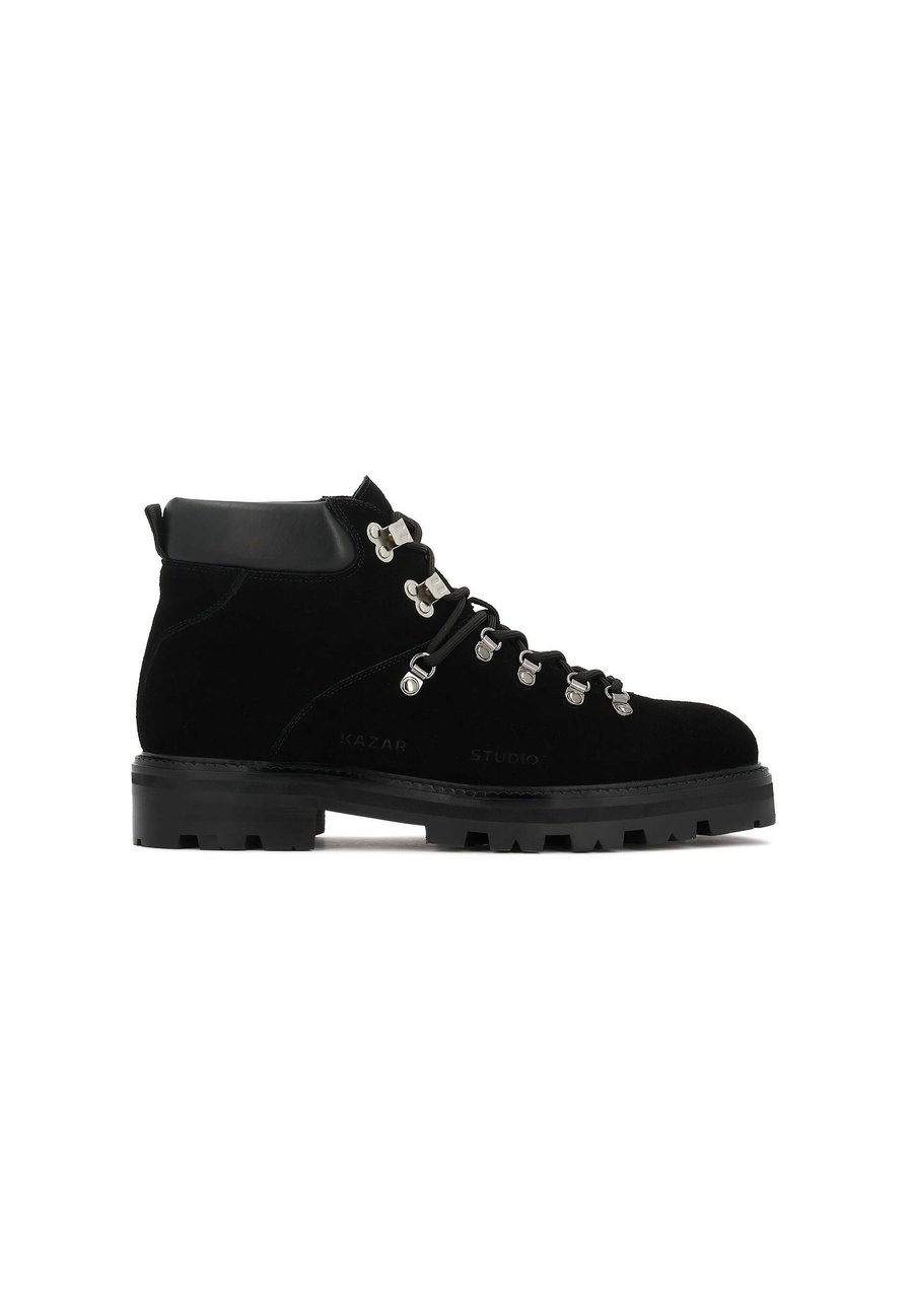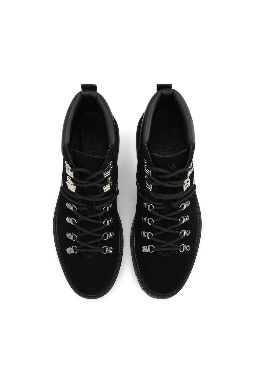 Современная интерпретация классической треккинговой обуви - черные мужские ботинки, изготовленные из комбинации мягкой замши и гладкой натуральной кожи. Прочная треккинговая подошва обеспечивает устойчивость и комфорт при ношении в любых условиях. Оригинальная шнуровка с серебристыми металлическими крючками придает обуви характерный, походный вид, одновременно гармонично вписываясь в городской стиль. Это идеальный выбор для мужчины, который ценит качество, функциональность и стильный дизайн. Подкладка выполнена из тонкой и мягкой овечьей кожи для максимального комфорта. Носок обуви: круглыйМатериал и уход