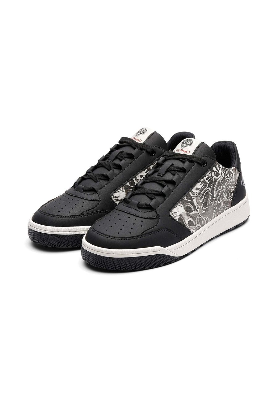 Мужские низкие кроссовки ACE LOW - FLAMES в черно-белом цвете. Классический минималистичный дизайн, идеально подходит для повседневной носки и непринужденного стиля выходного дня. Прочный верх из синтетической кожи и дышащий сетчатый язычок. Сетчатая подкладка обеспечивает быстрое впитывание влаги, сохраняя ноги сухими и прохладными. Резиновая подошва обеспечивает отличное сцепление, амортизацию и долговечность. Градиентный эффект пламени, нанесенный методом цифровой печати, остается изысканным, почти акварельным, что дополняет лаконичный силуэт обуви. Носок обуви: круглыйМатериал и уход