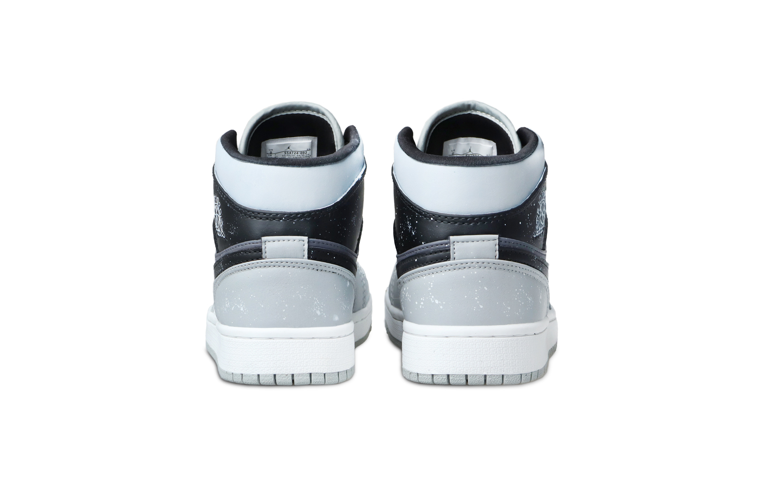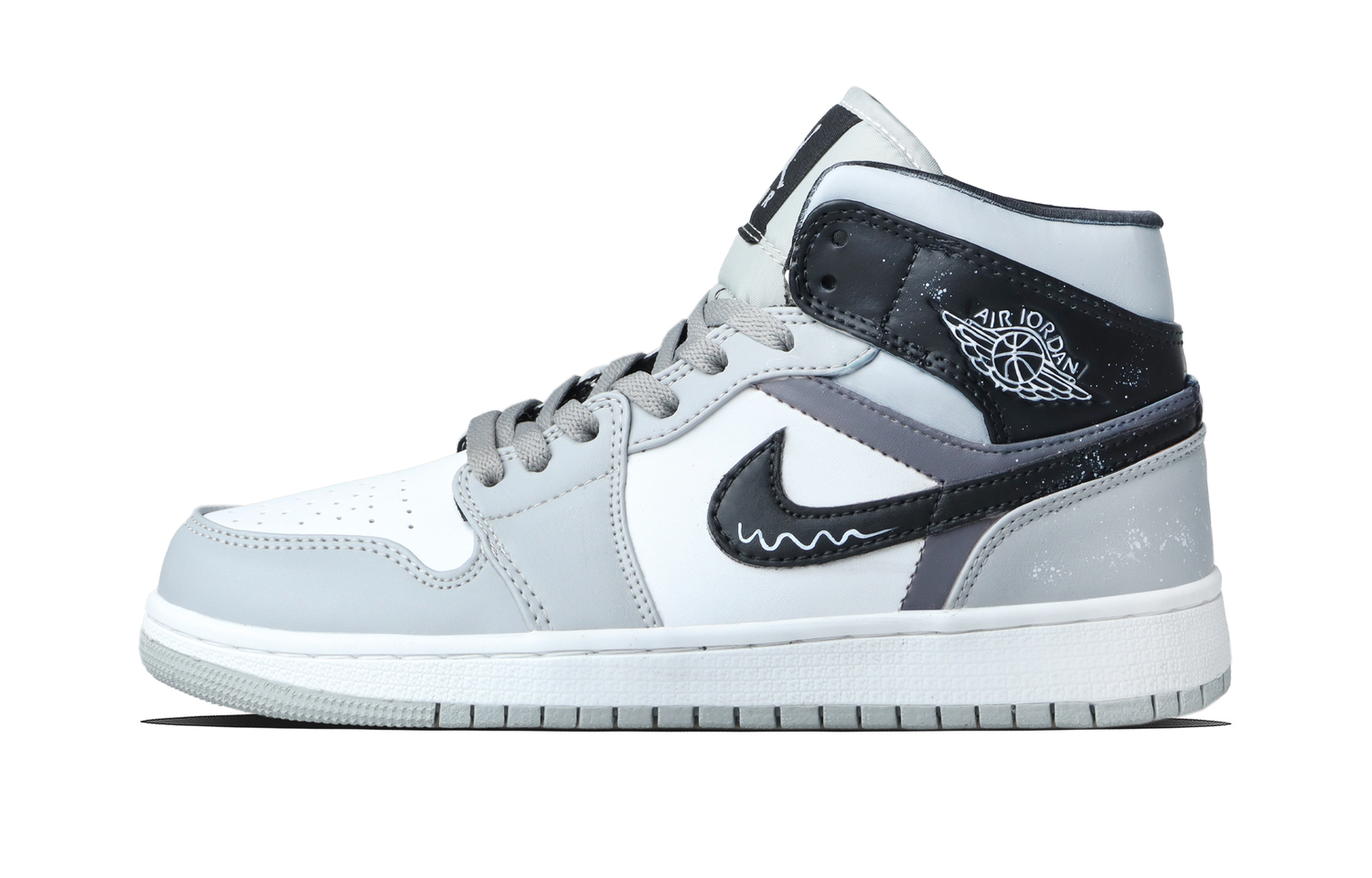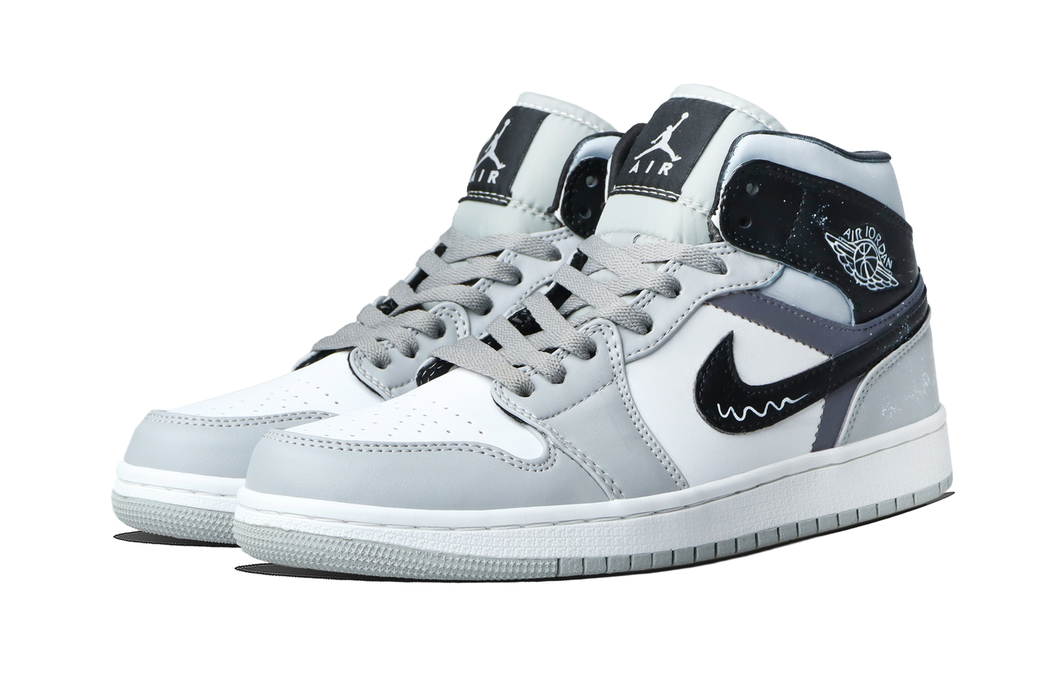 Эти кастомные кроссовки созданы на основе оригинальной модели Jordan Air Jordan1 Mid Light Smoke Grey. Цветовая гамма проста и универсальна, а элементы декора в стиле граффити добавляют нотку оригинальности.