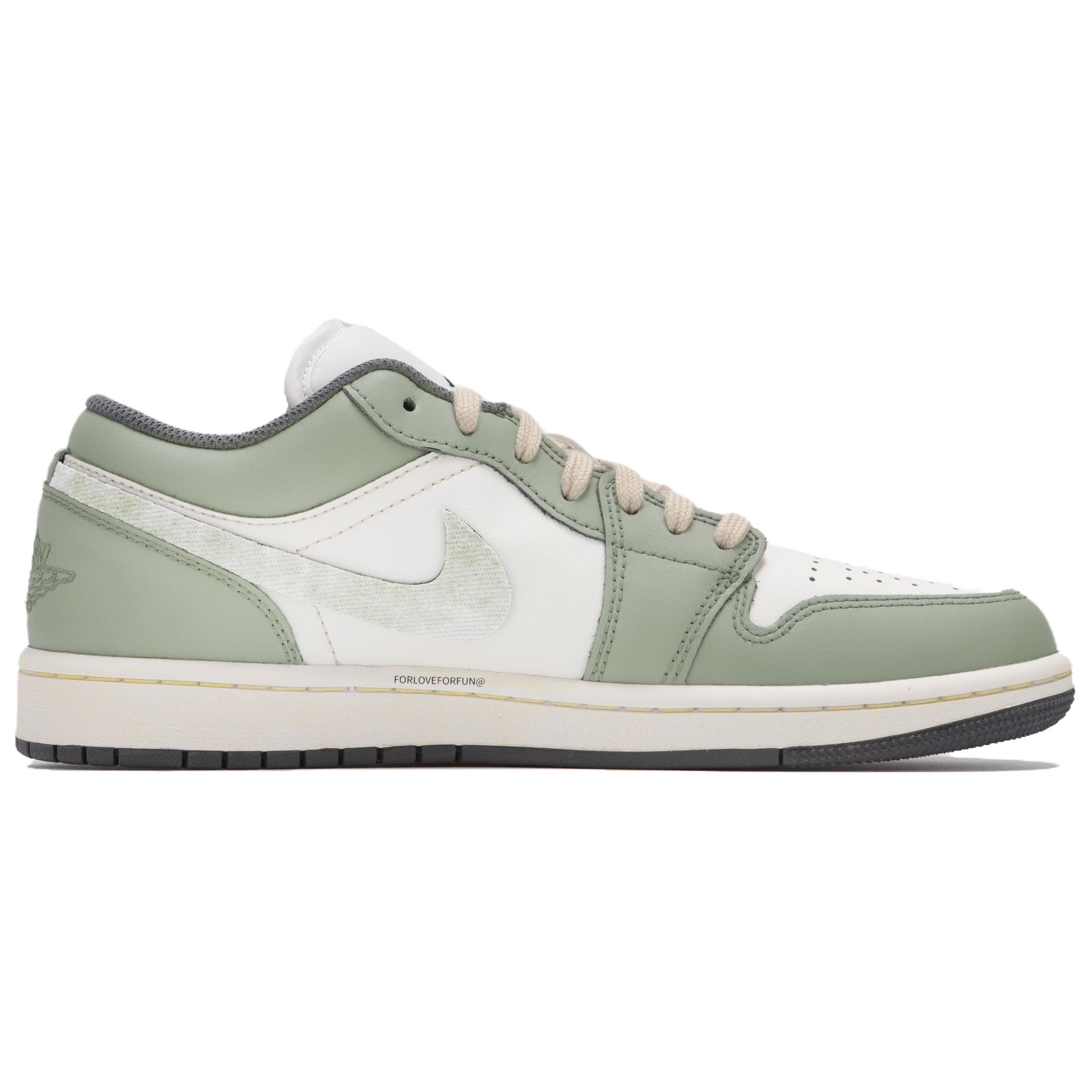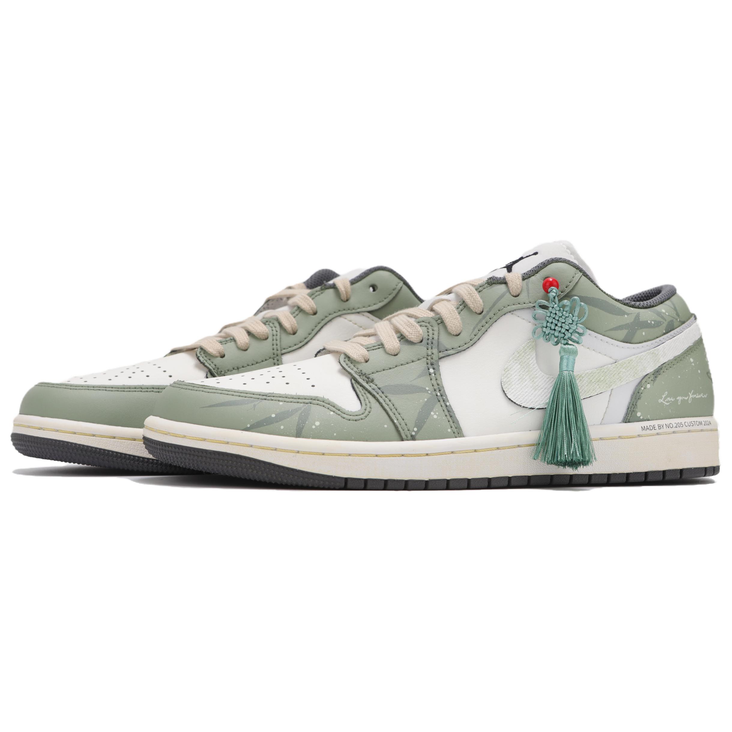 Эти кастомные кроссовки созданы на основе оригинальных ретро-баскетбольных кроссовок Jordan Air Jordan 1. Дизайн вдохновлён бамбуком. Мягкая цветовая гамма сочетает в себе оттенки белого и приглушённого зелёного, логотип Swoosh сбоку выполнен в стиле лоскутного денима с эффектом тай-дай, а состаренная межподошва создаёт ощущение премиальности. Эта модель имеет эффект потертости и окрашивания; неравномерная окраска и пожелтение, вызванные окислением, являются элементами дизайна, а не дефектами.