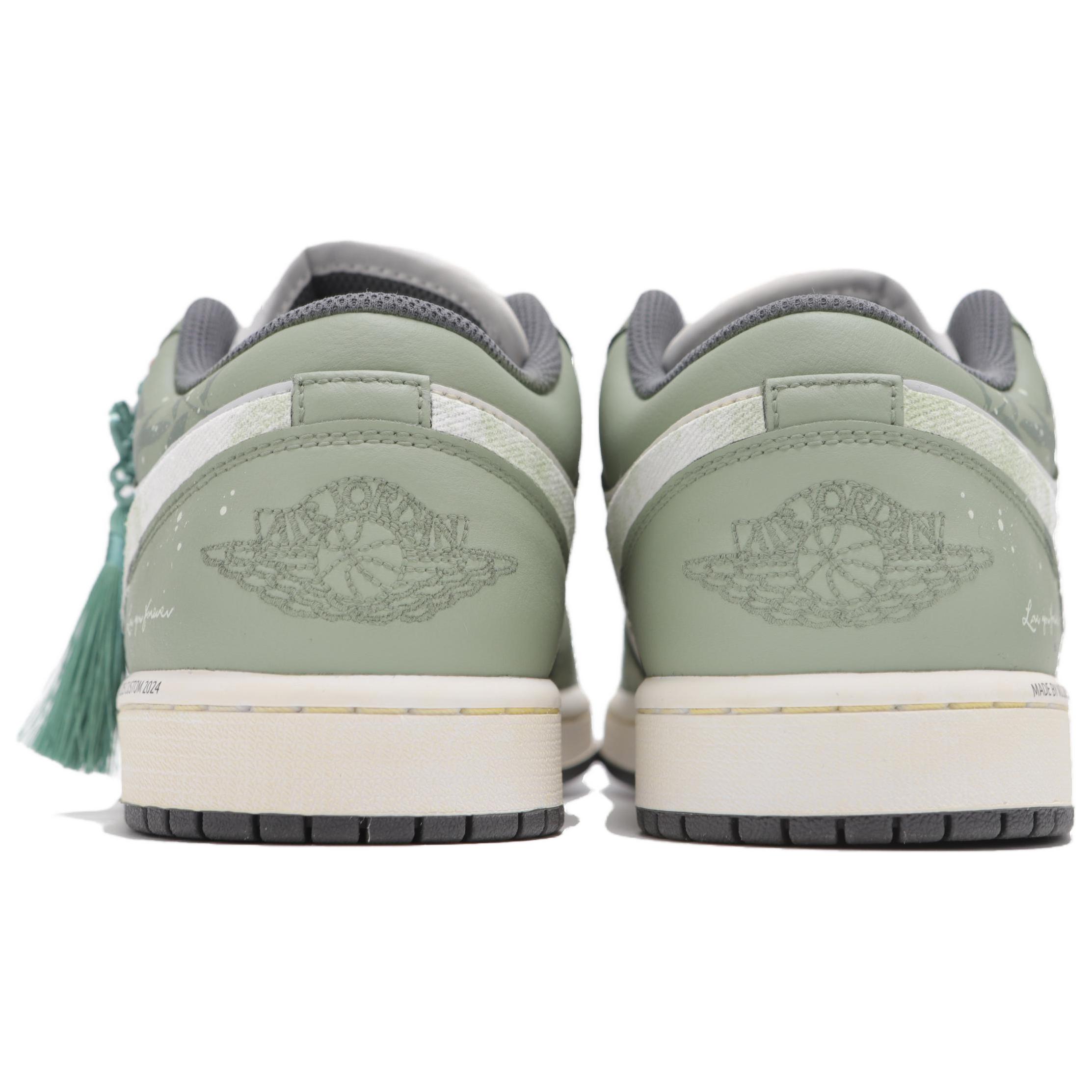 Эти кастомные кроссовки созданы на основе оригинальных ретро-баскетбольных кроссовок Jordan Air Jordan 1. Дизайн вдохновлён бамбуком. Мягкая цветовая гамма сочетает в себе оттенки белого и приглушённого зелёного, логотип Swoosh сбоку выполнен в стиле лоскутного денима с эффектом тай-дай, а состаренная межподошва создаёт ощущение премиальности. Эта модель имеет эффект потертости и окрашивания; неравномерная окраска и пожелтение, вызванные окислением, являются элементами дизайна, а не дефектами.