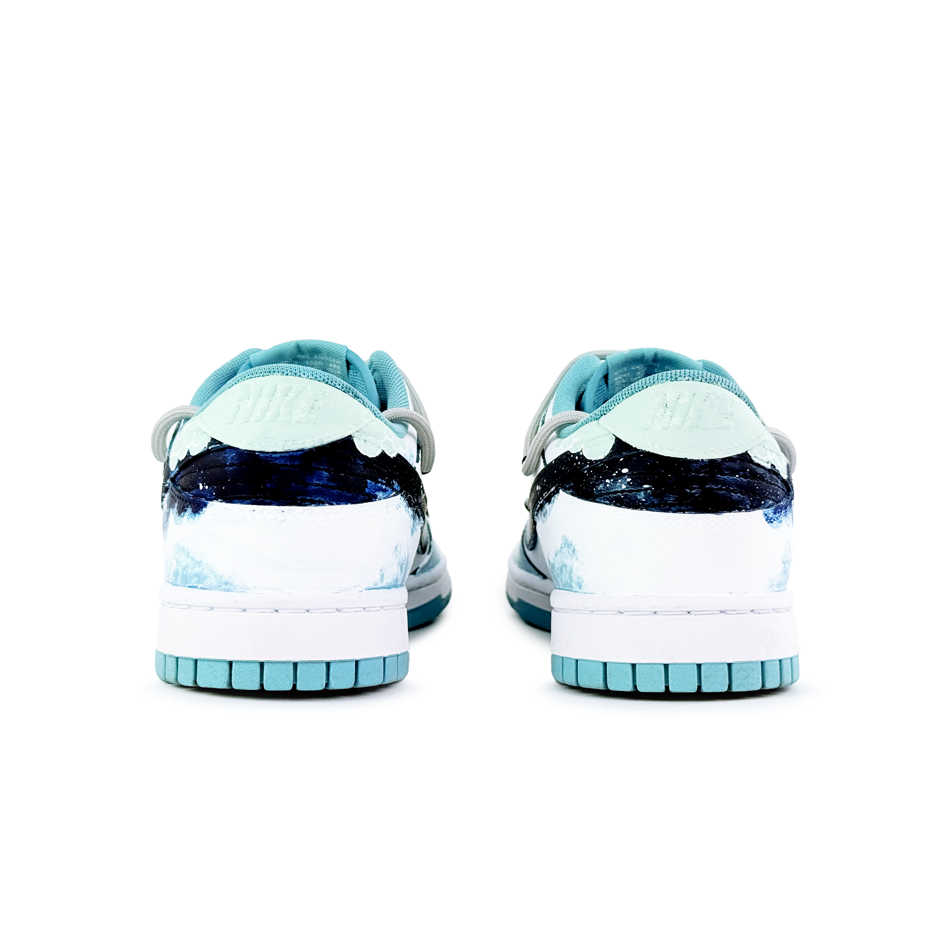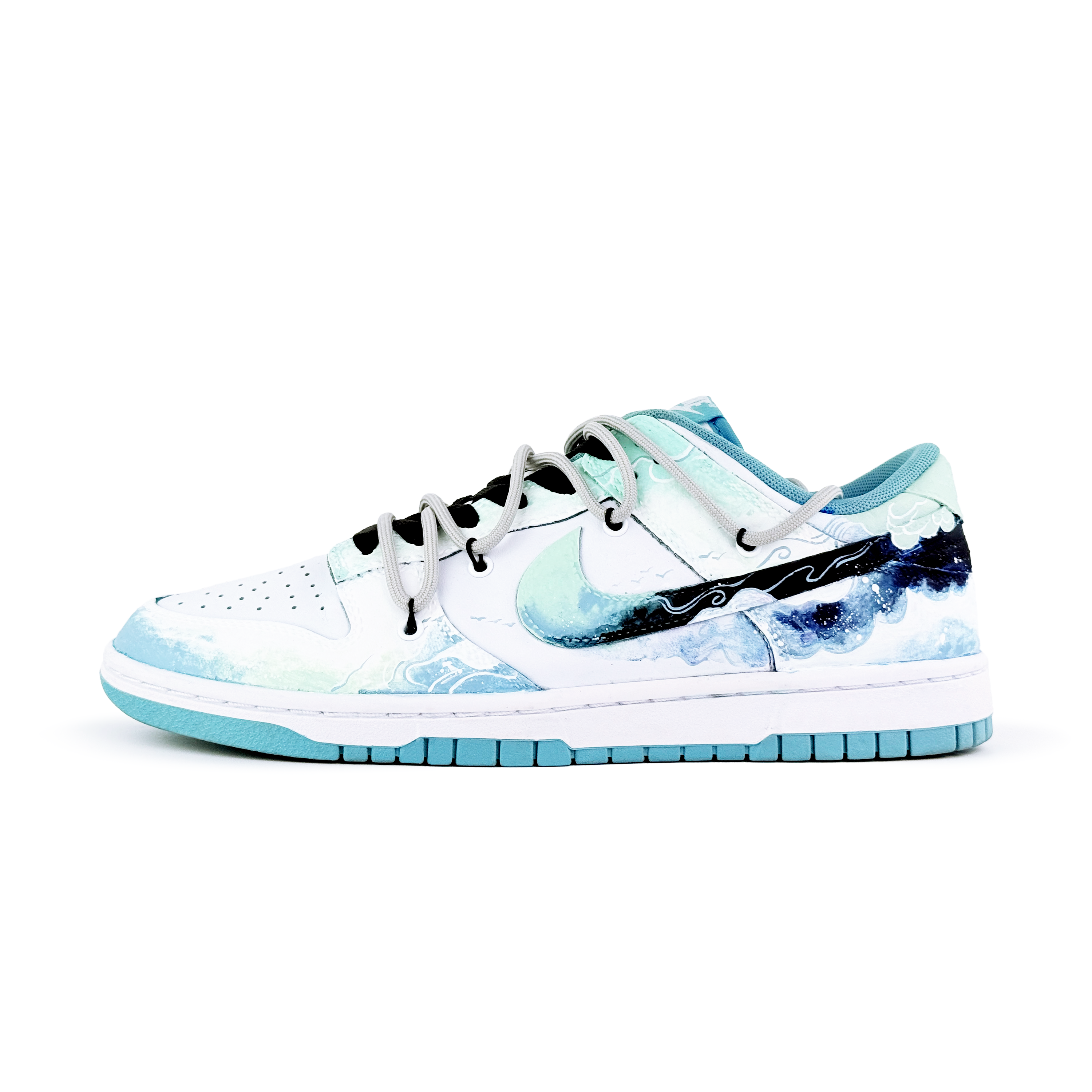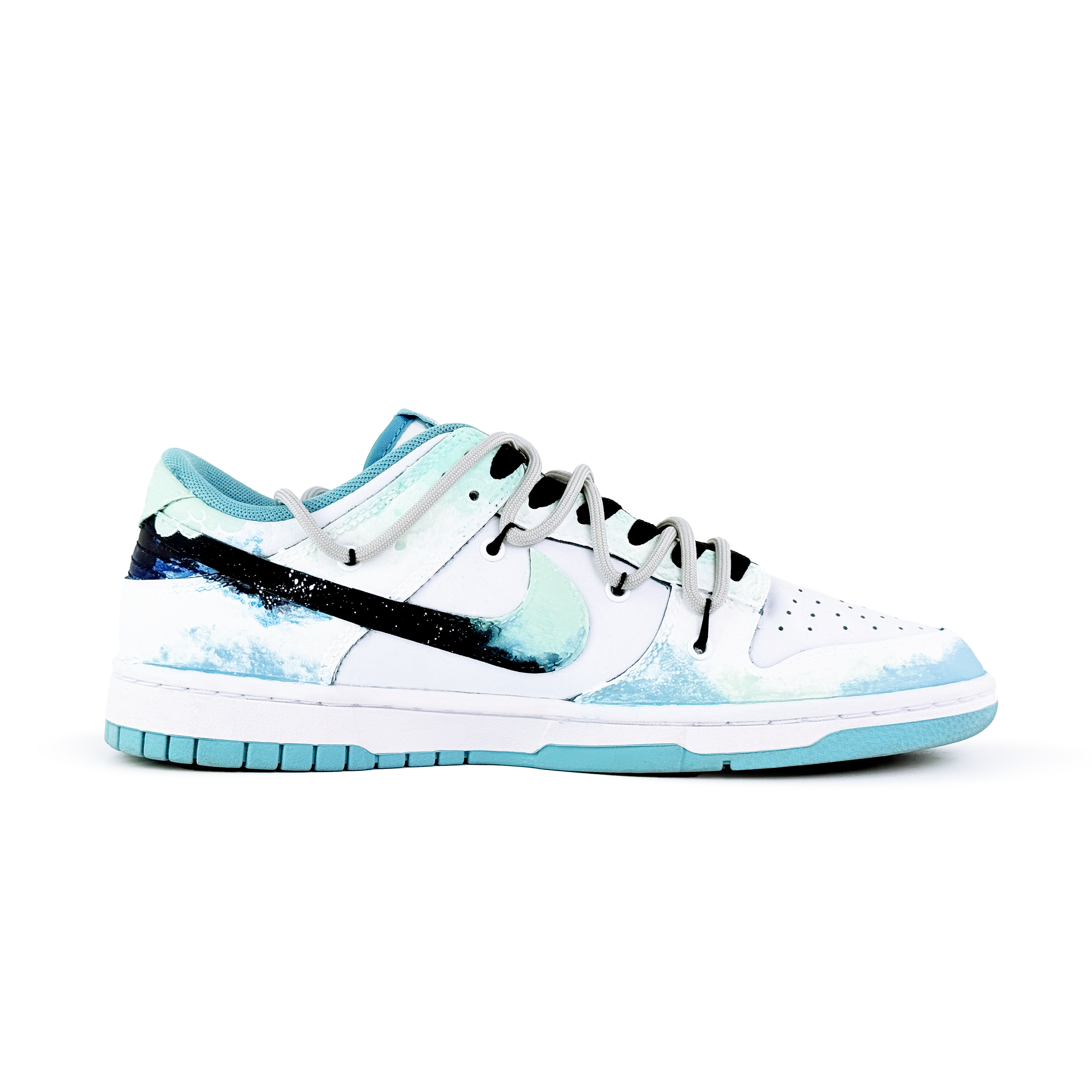 Эти кастомные кроссовки созданы на основе оригинальной модели Nike Dunk Low. Общая цветовая гамма - ледяной синий, с градиентным граффити, выполненным методом распыления, с основным мотивом - пейзажными узорами. Вдохновленный традиционными китайскими элементами дизайна, дизайн лёгкий и жизнерадостный, излучающий позитивную энергию. В целом, кроссовки выглядят простыми, изысканными и универсальными.