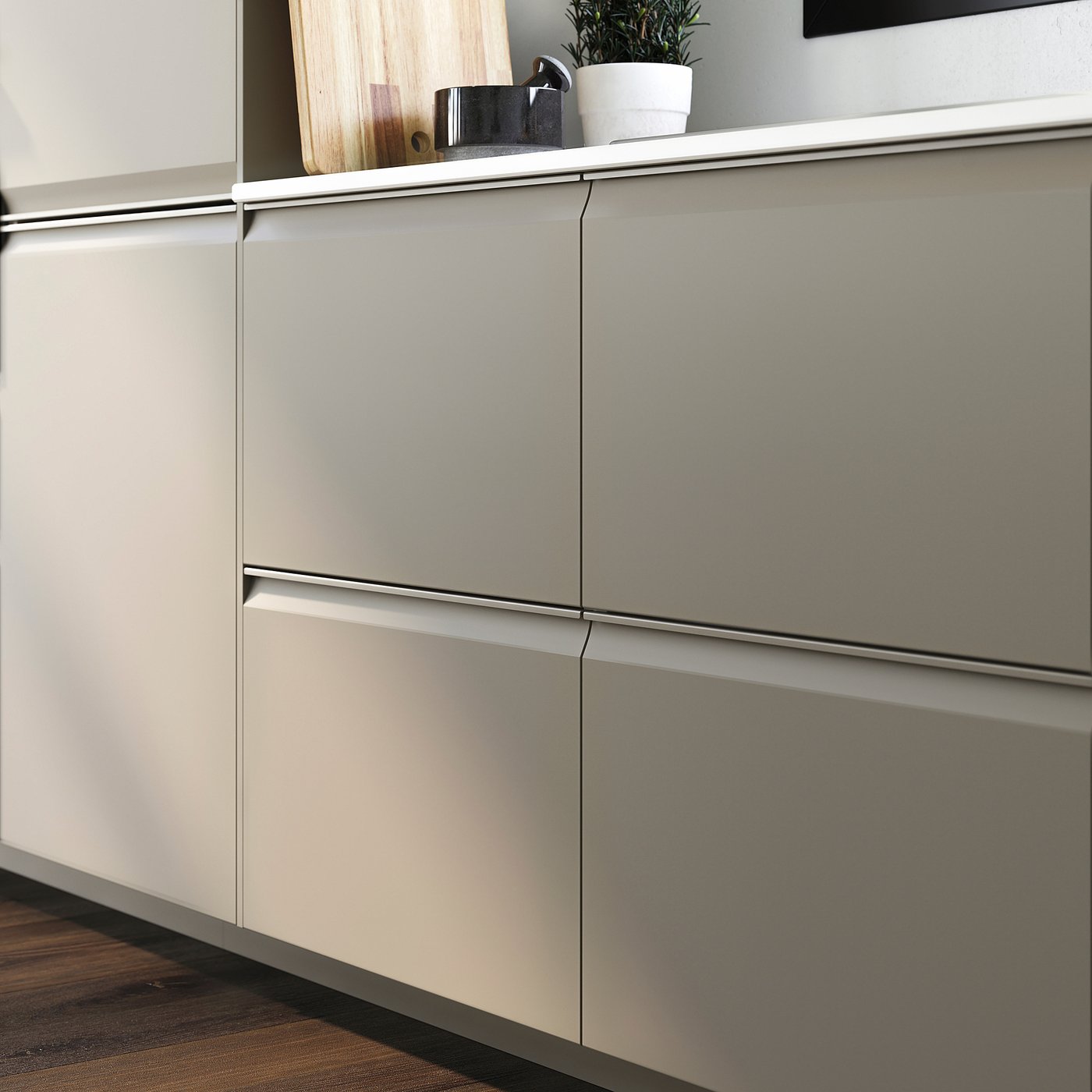 Встроенная алюминиевая ручка бежевого цвета гармонирует с фасадом, создавая современный и графичный вид. Она также обеспечивает устойчивость и имеет удобный и естественный захват.