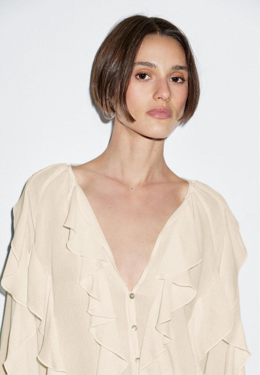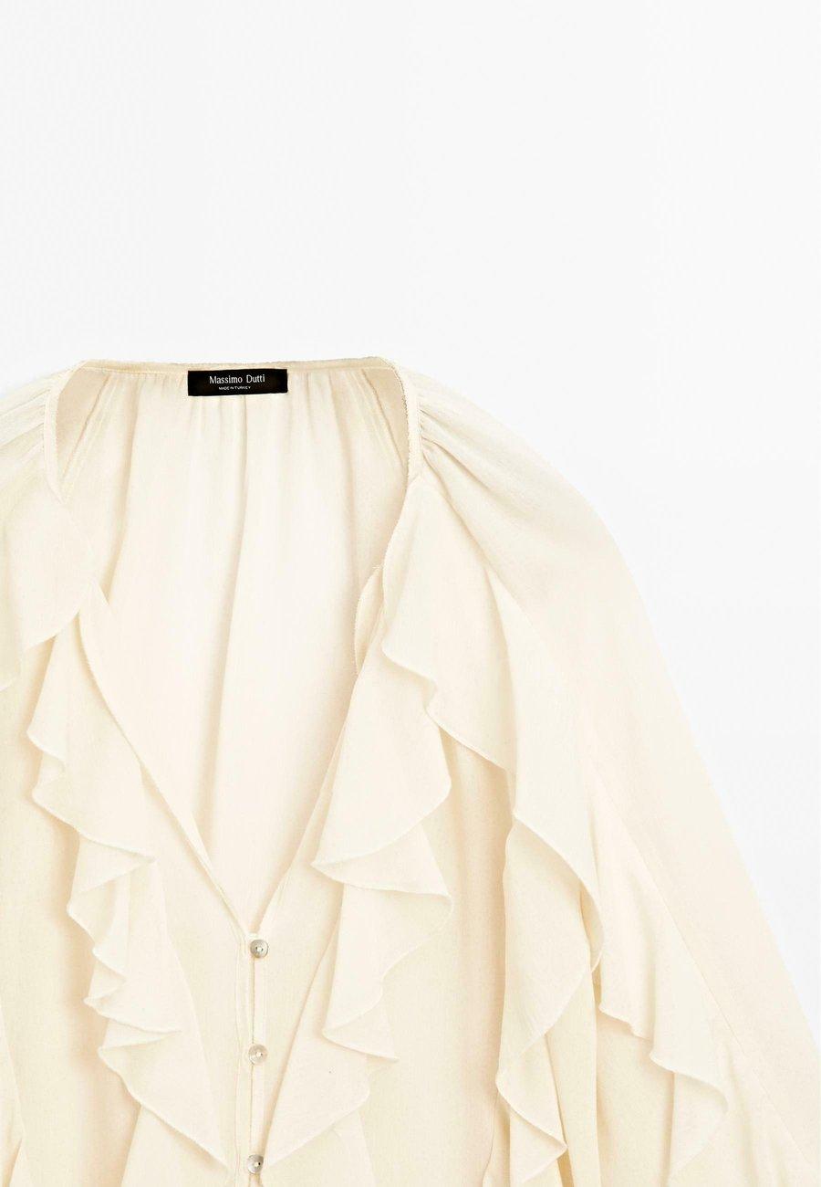 V-образный вырез. Оборки. Длинные рукава. Струящаяся блузка. Застежка на пуговицы спереди. Вырез горловины: V-образный.Материал и уход