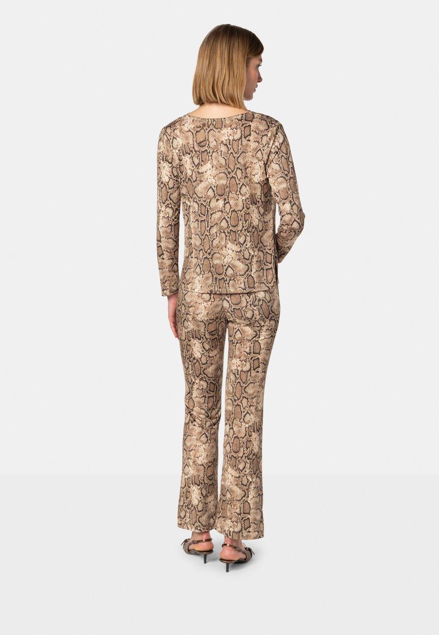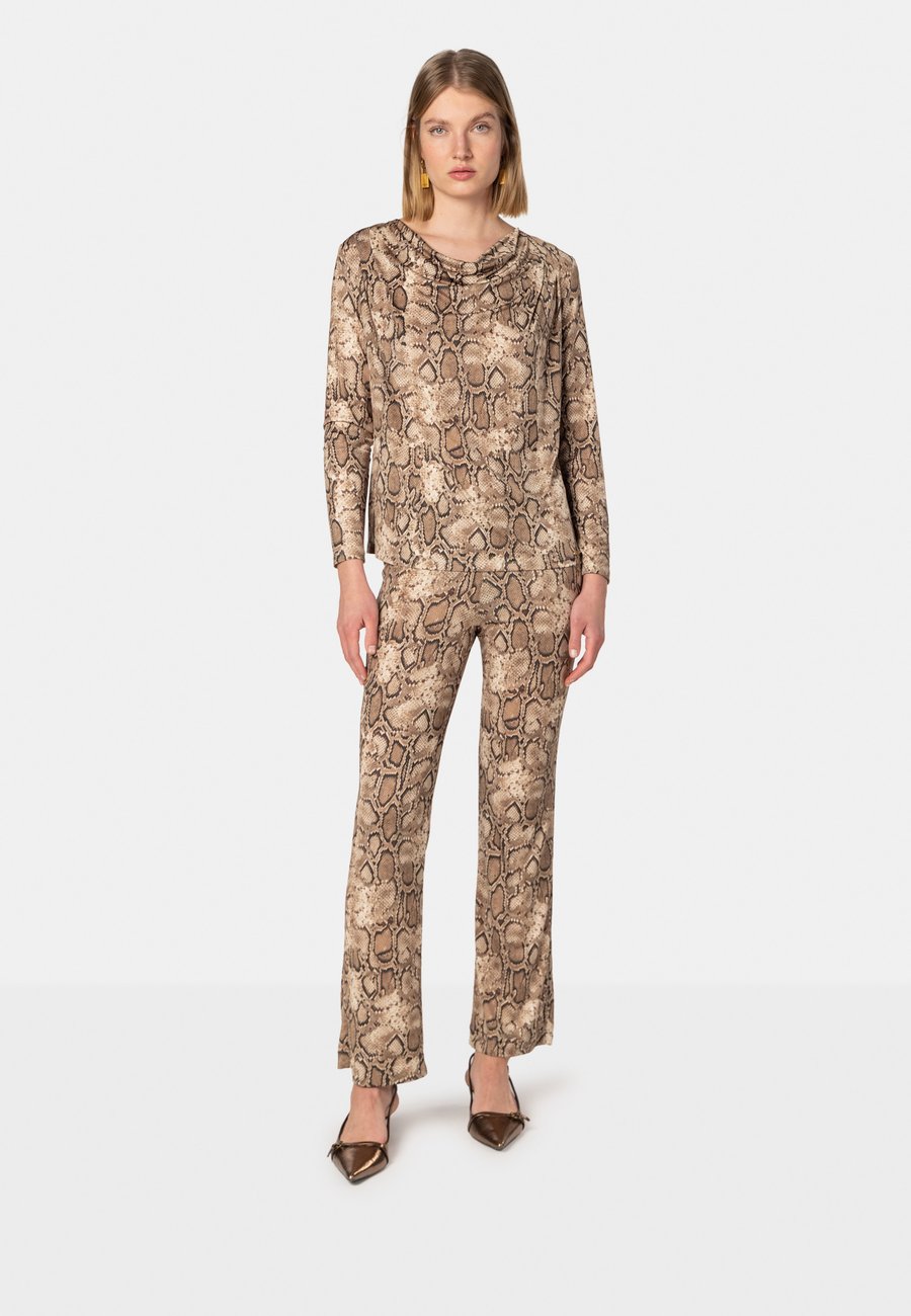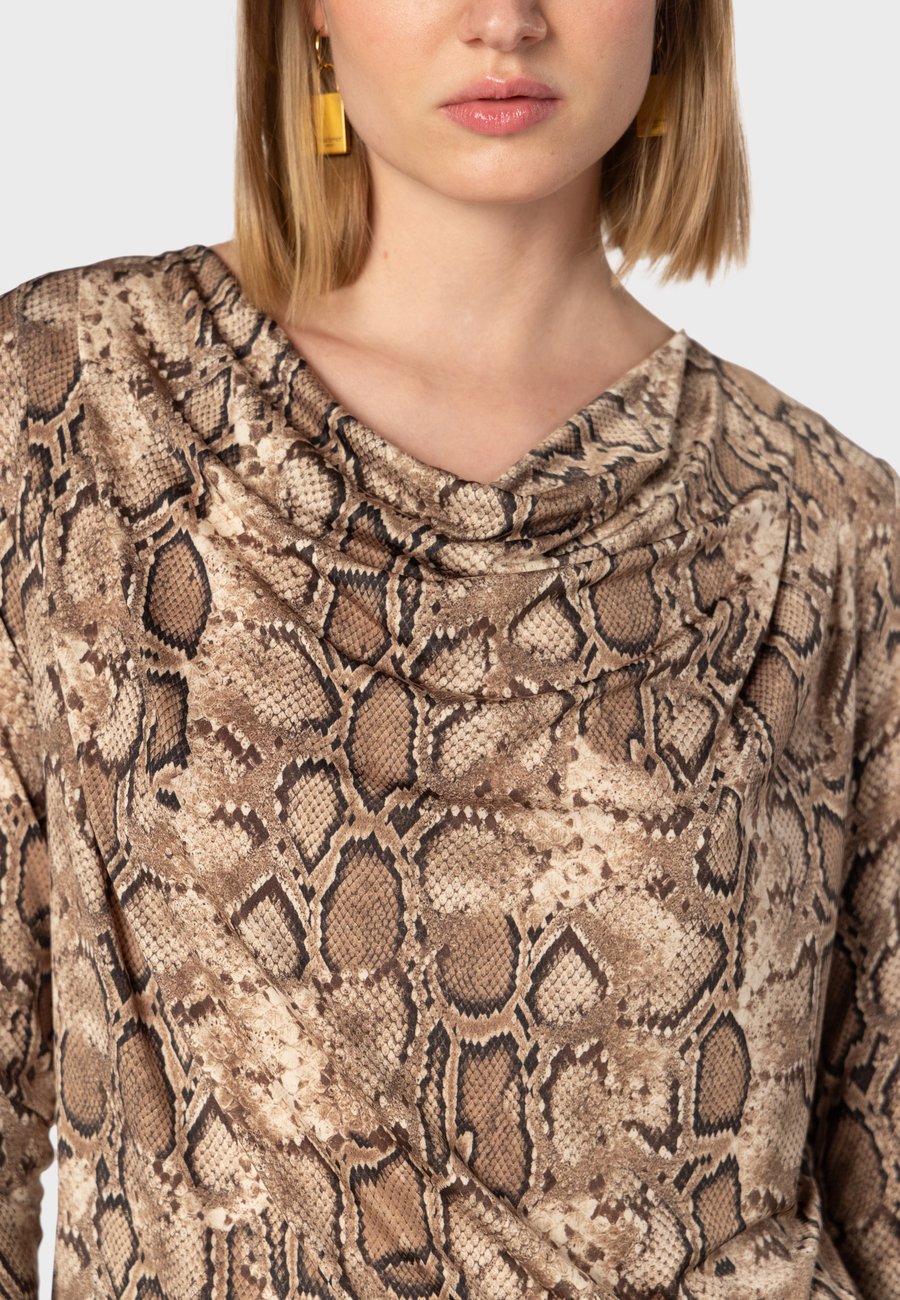 Топ из трикотажа с принтом под змеиную кожу, с драпированным вырезом горловины для изысканного вида, длинными рукавами и струящимся кроем, который легко переходит из дневного образа в вечерний. Дизайн, отделка, сборка, стежка и ткачество: Испания. Вырез горловины: Воротник-хомут.Материал и уход