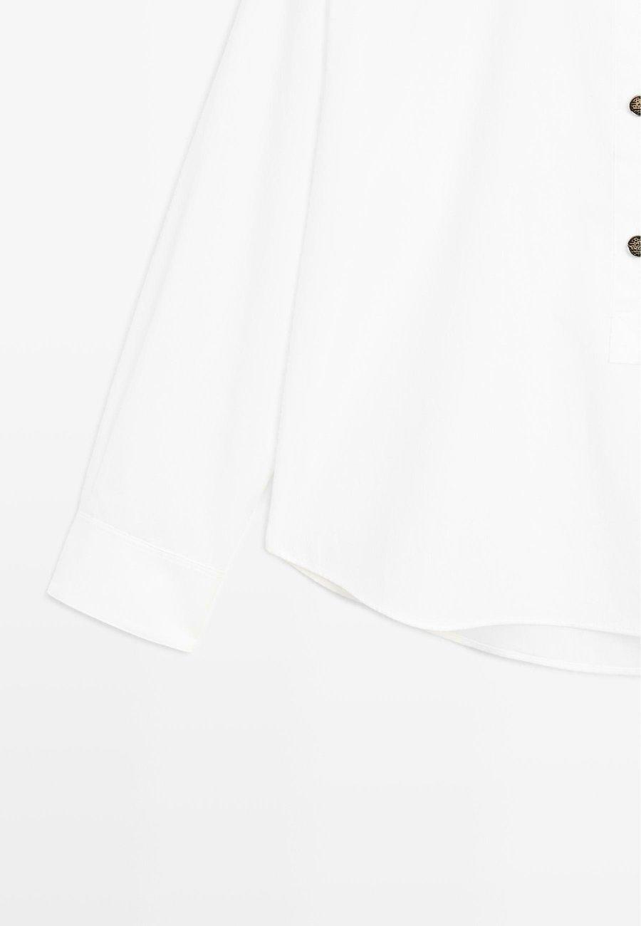 Широкий и свободный силуэт, не приталенный. Воротник-стойка. Рубашка из 100% хлопка. Длинные рукава с манжетами на пуговицах. Застежка на четыре пуговицы. Воротник: Воротник-стойкаМатериал и уход