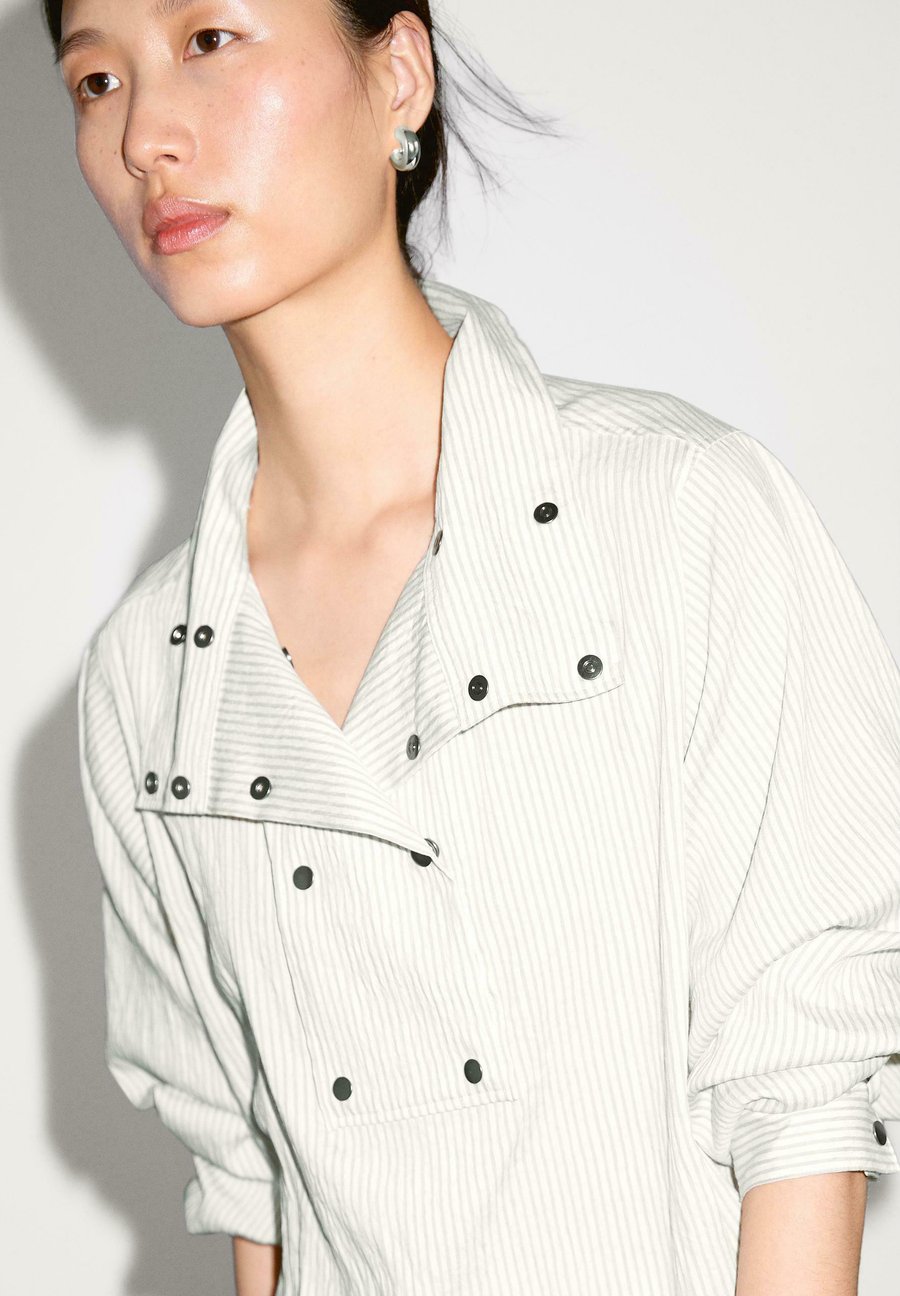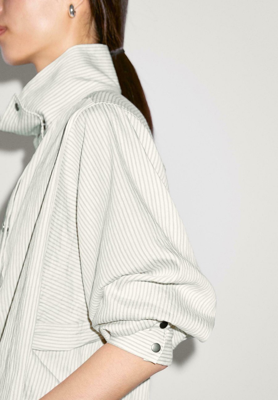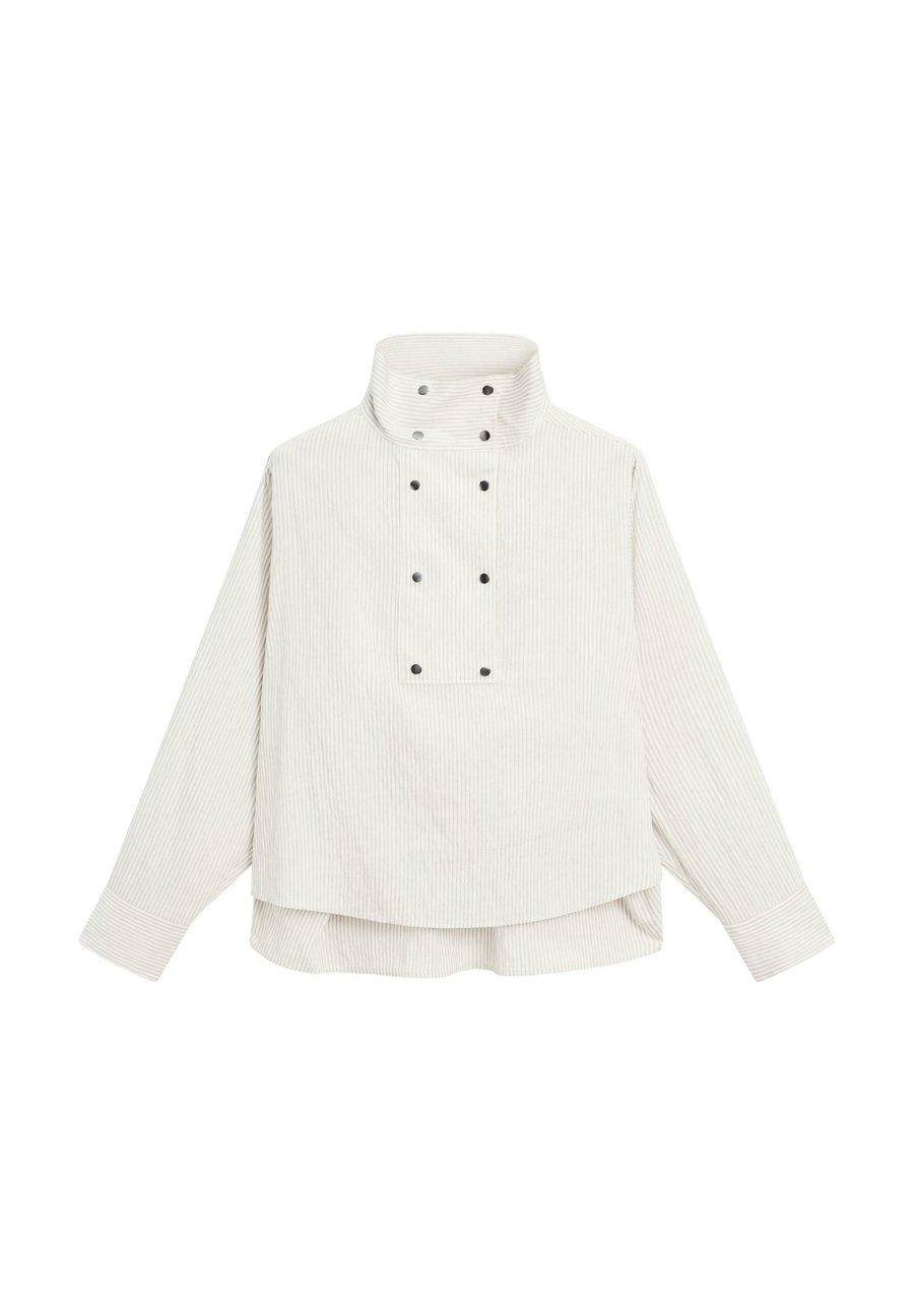 Полосатый принт. Изготовлено из смесовой льняной ткани. Длинные рукава. Высокий воротник-хомут. Струящаяся рубашка. Застегивается на кнопки. Воротник: Высокий воротникМатериал и уход