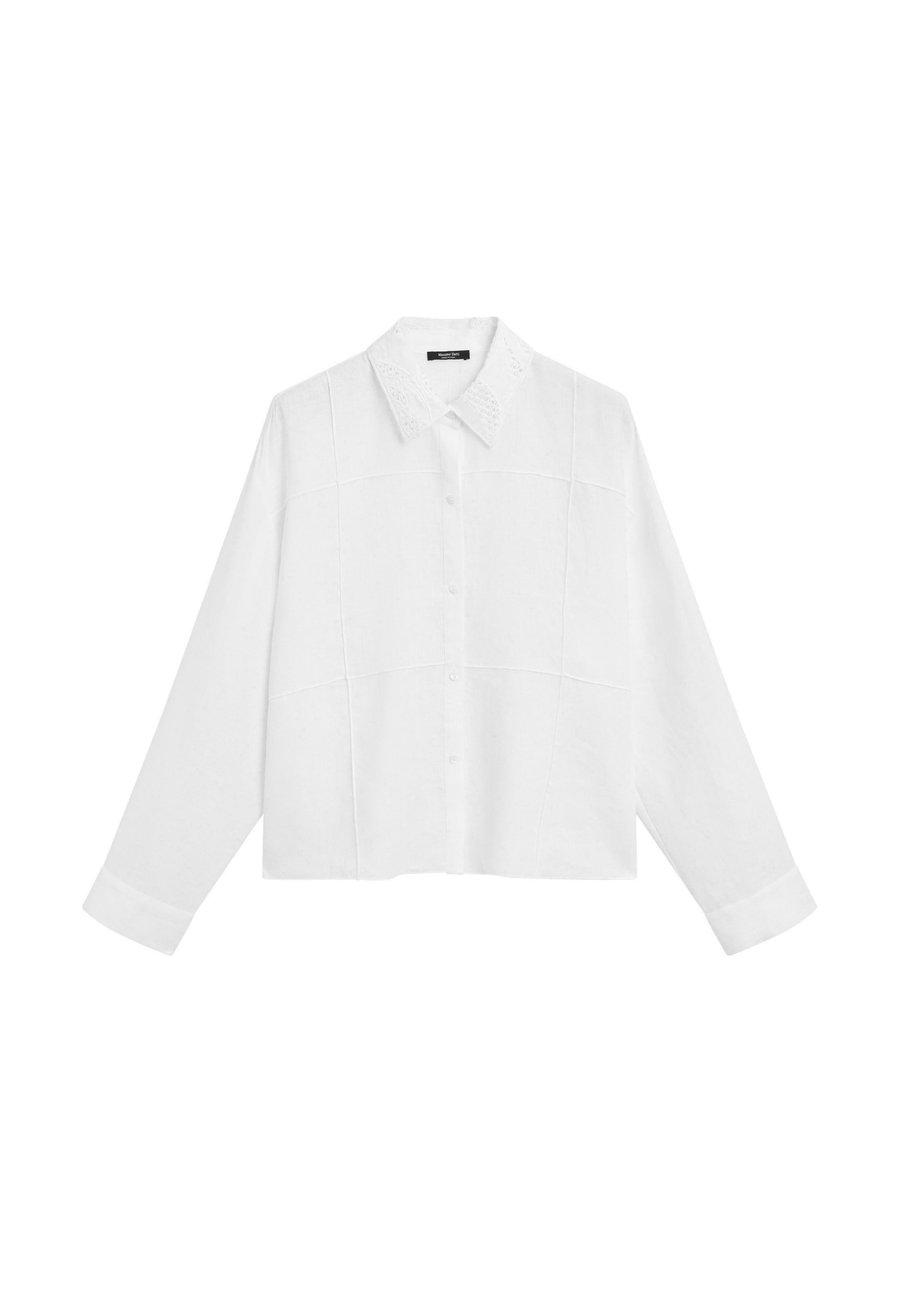 Широкий и свободный силуэт, не приталенный. Рубашка из 100% льна. Рубашечный воротник. Ажурная ткань. Длинные рукава с манжетами на пуговицах. Декоративная вышивка. Застежка на пуговицы спереди. Воротник: Рубашечный воротникМатериал и уход