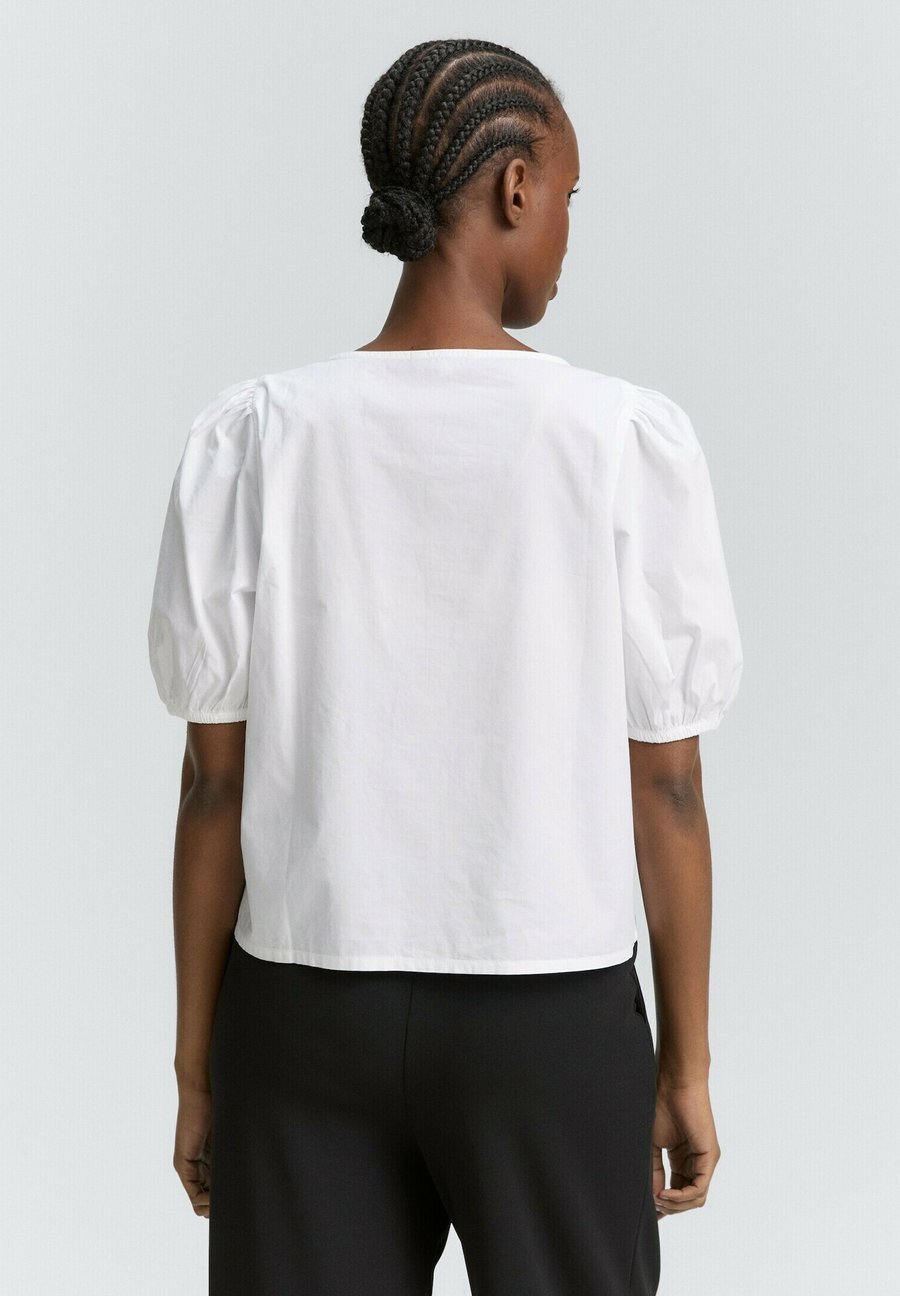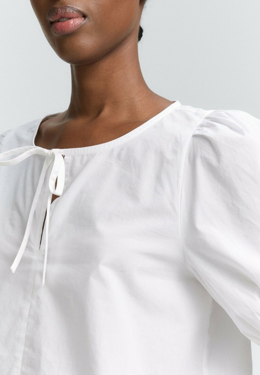 Блузка из поплина из хлопка с бантом на вырезе и рукавами-фонариками с эластичным поясом по низу рукава. Вырез: КруглыйМатериал и уход