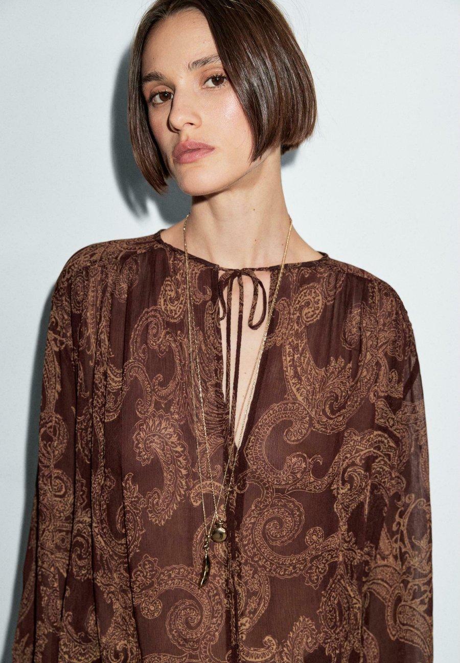 V-образный вырез, который можно закрепить шнуровкой. Полупрозрачная ткань. Принт пейсли. Длинные рукава. Застежка спереди. Струящаяся блузка из фактурной ткани. Вырез: КруглыйМатериал и уход