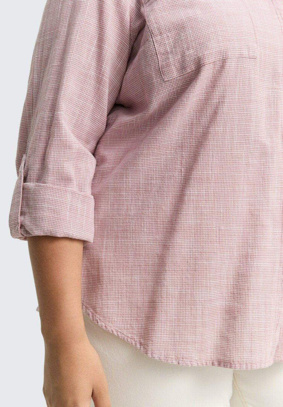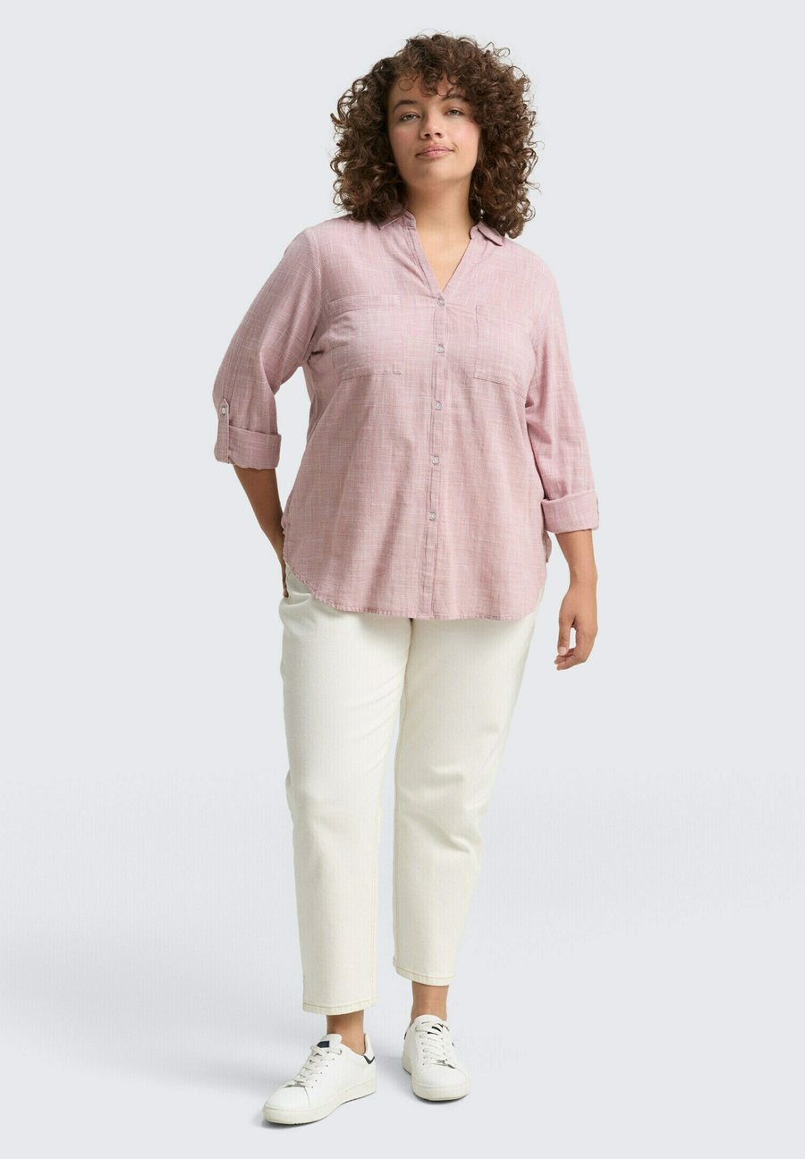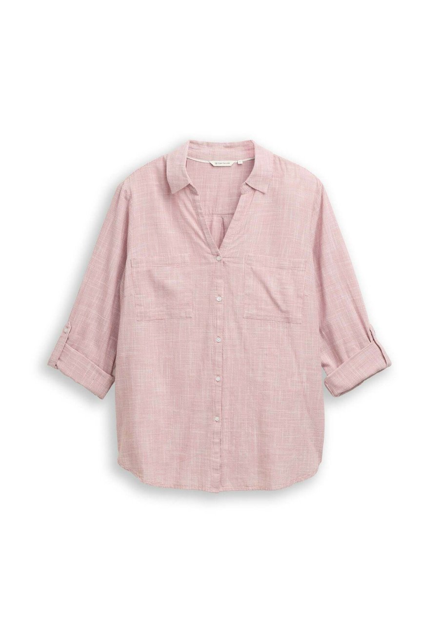 Блузка-рубашка с двумя накладными нагрудными карманами и отворотами на рукавах для регулировки длины рукавов. Изготовлено из мягкой, слегка фактурной хлопчатобумажной ткани. Вырез горловины: V-образныйМатериал и уход