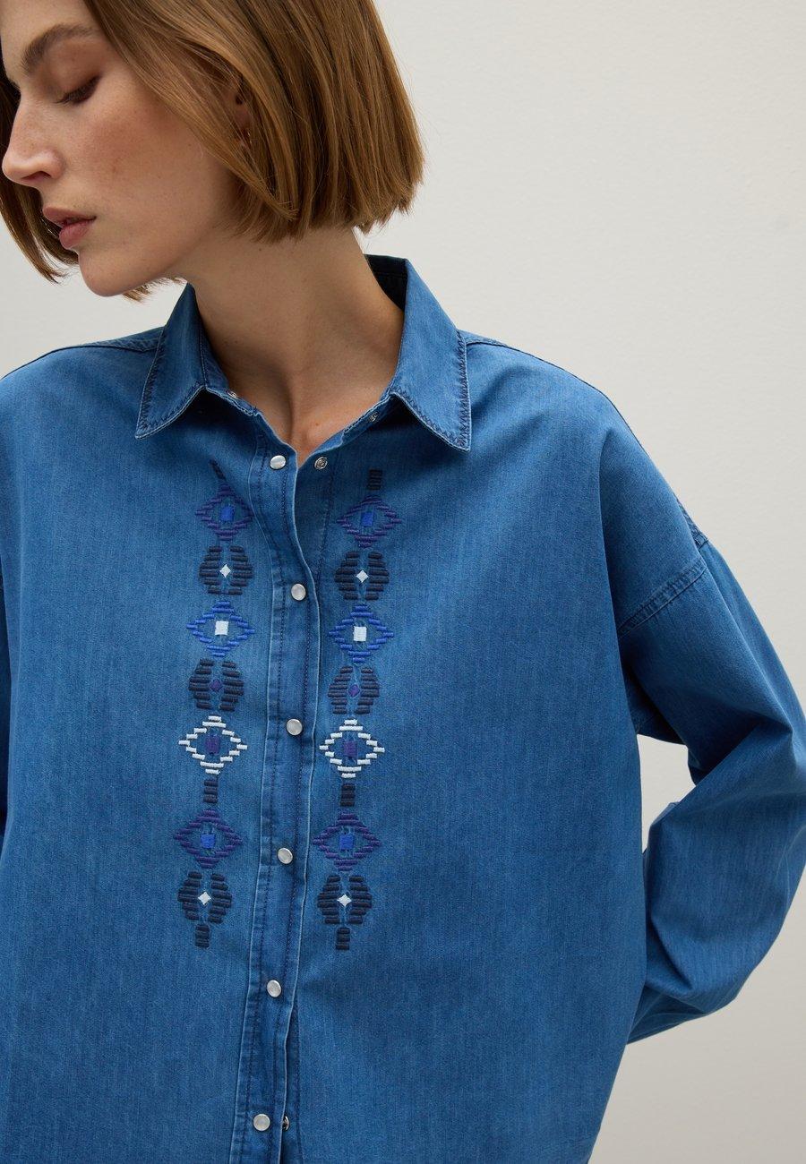 Откройте для себя нашу синюю рубашку Piombo, изготовленную из чистого хлопка для максимального комфорта. Классический дизайн дополнен элегантной геометрической вышивкой на передней части, добавляющей изысканности. Застежка на пуговицы и классический воротник делают ее идеальной для создания повседневного шикарного образа в осенне-зимний сезон. Сочетайте его с белыми брюками для создания изысканного и вневременного образа. Вырез: ХенлиМатериал и уход