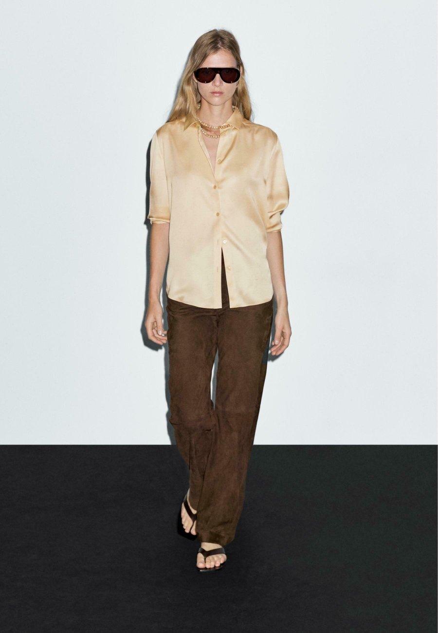 Воротник рубашки. Длинные рукава с манжетами на пуговицах. Рубашка из струящейся атласной ткани. Застежка на пуговицы спереди. Воротник: Рубашечный воротникМатериал и уход