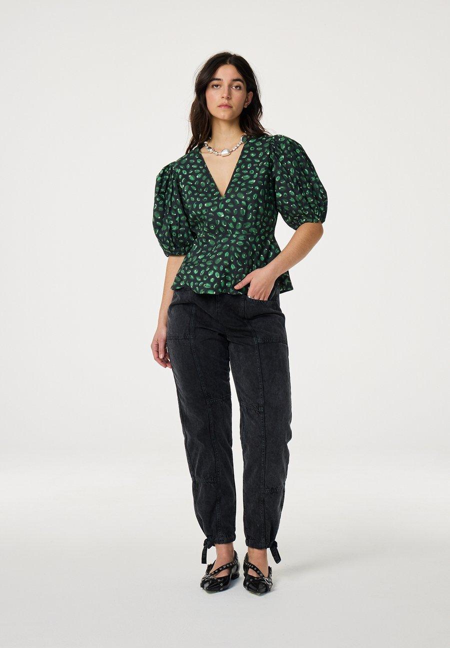 Эта блузка с короткими рукавами и принтом в виде темно-зеленых мини-оливок одновременно элегантна и стильна. Она имеет V-образный вырез и изготовлена из 100% органического хлопка. Сочетайте его с черной юбкой и сандалиями для создания особого образа. Вырез: глубокий V-образныйМатериал и уход