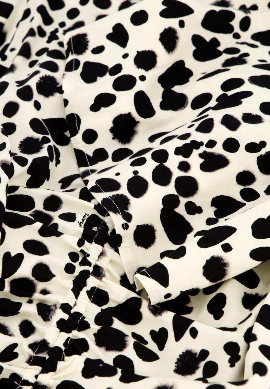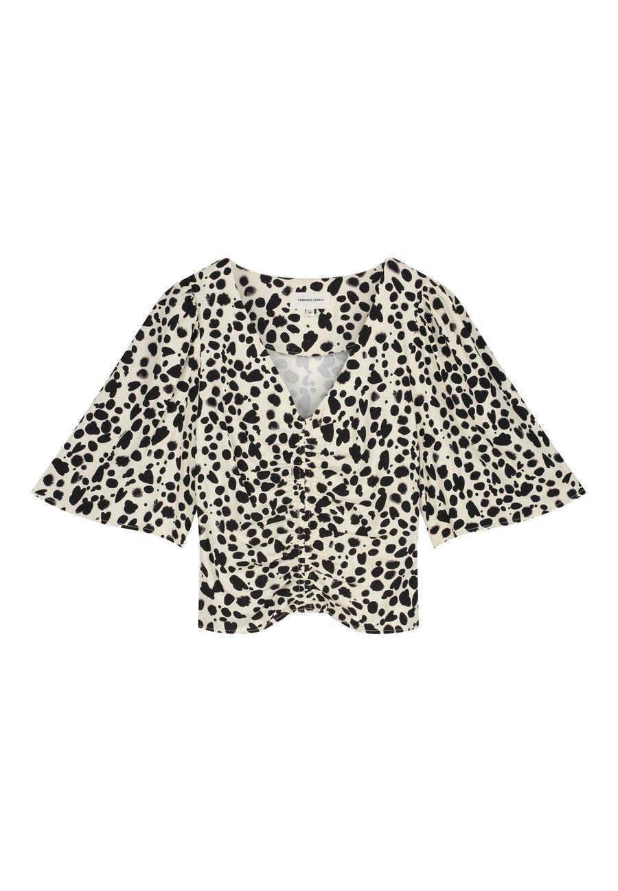 Этот облегающий топ с короткими рукавами украшен стильным черно-белым принтом и имеет привлекательный V-образный вырез. Изготовлен из мягкой смеси вискозы и вискозного волокна, он легкий и удобный. Идеально подходит для теплых дней и легко сочетается с другой одеждой. Вырез горловины: глубокий V-образный вырезМатериал и уход