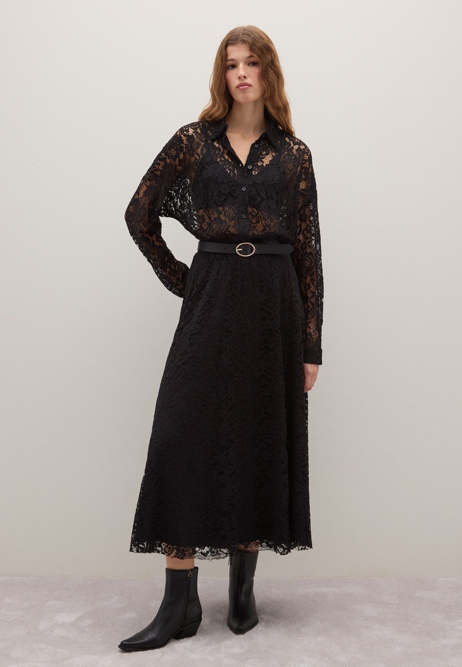 Черная прозрачная кружевная рубашка из линии PIOMBO станет уникальным дополнением к вашему осенне-зимнему гардеробу. Она имеет стандартный крой и длинные рукава для максимального комфорта. Прозрачность кружева добавляет изысканности и стиля, делая ее идеальной для особых вечеров и важных событий. Идеально сочетается с элегантными брюками или юбками для создания изысканного образа. Вырез горловины: ХенлиМатериал и уход