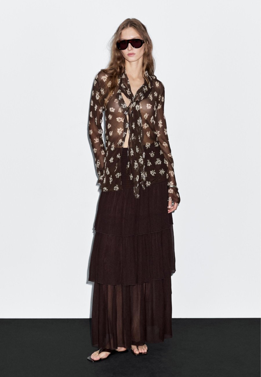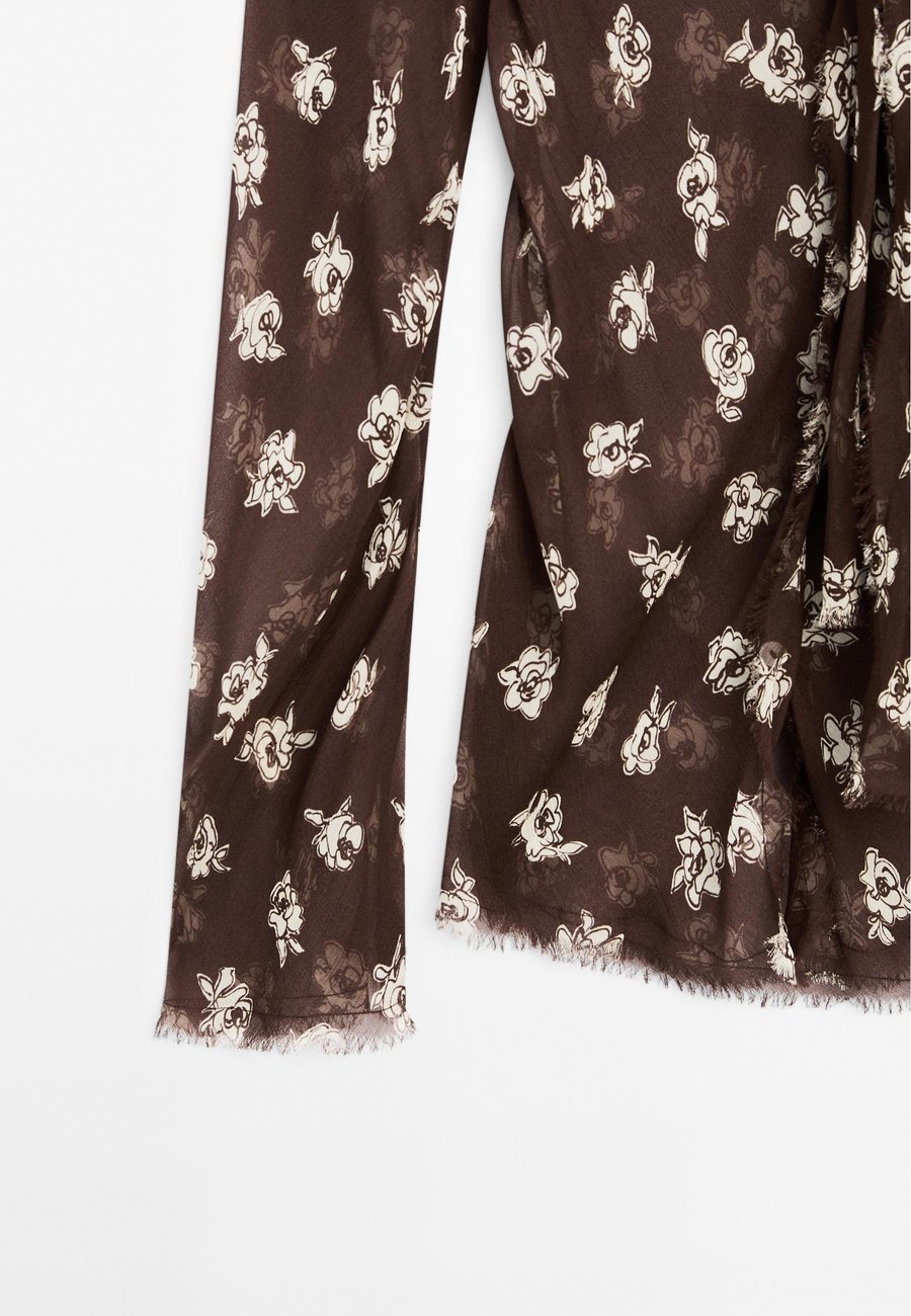 С принтом. Длинные рукава. Бахрома. Струящаяся рубашка из полупрозрачной ткани. Воротник с завязками в виде шали. Застежка на пуговицы спереди. Воротник: ШальМатериал и уход