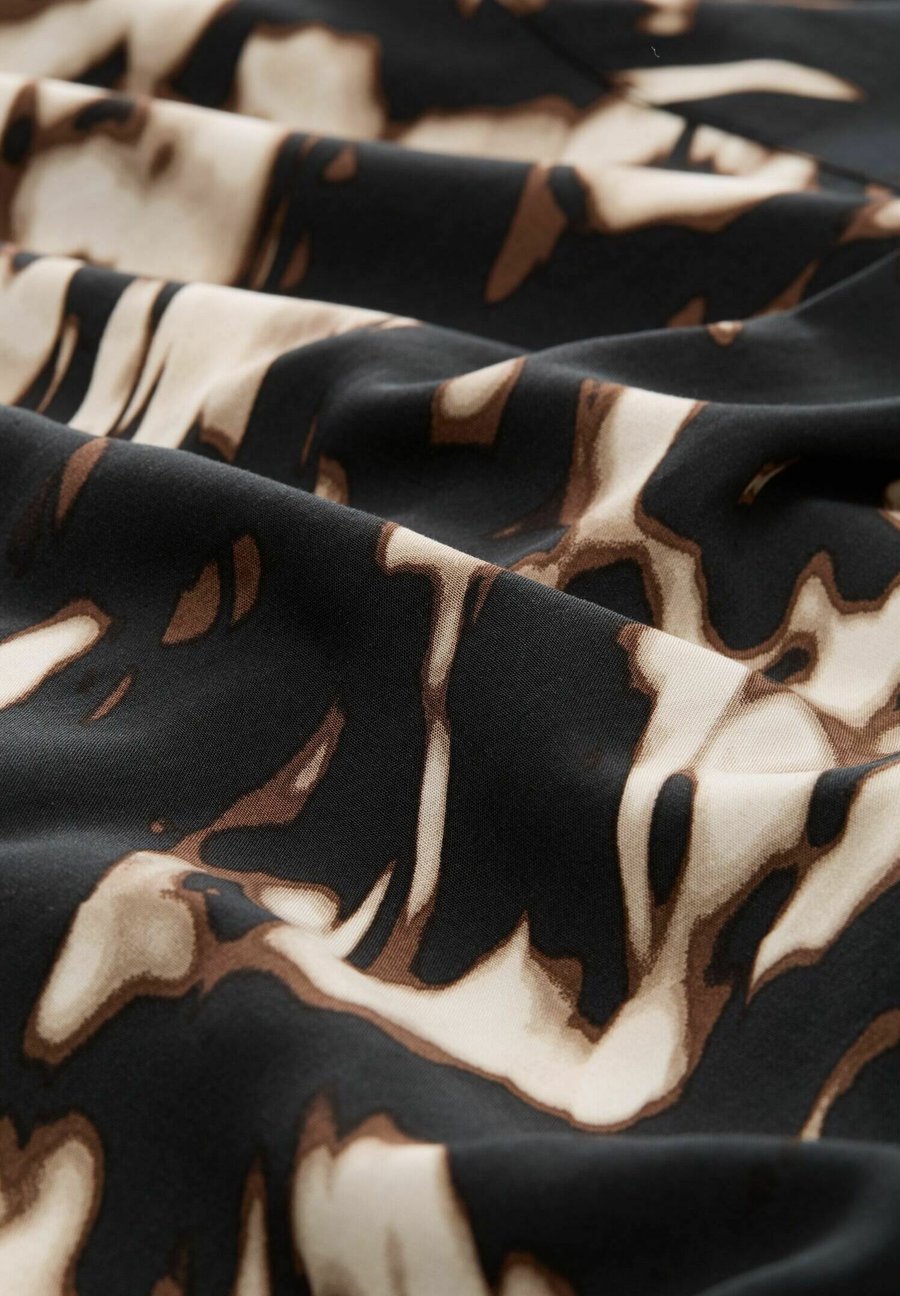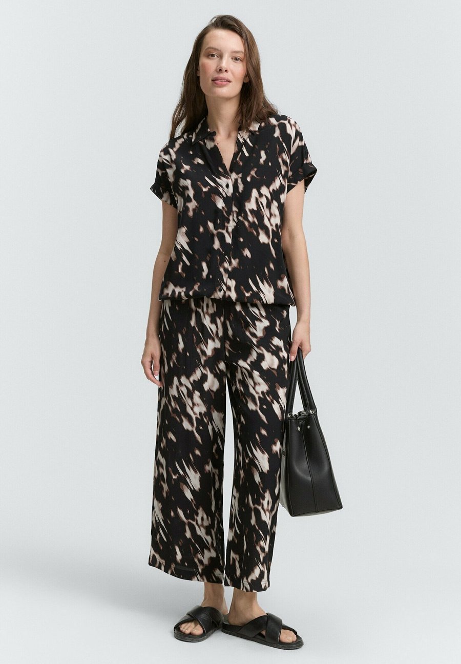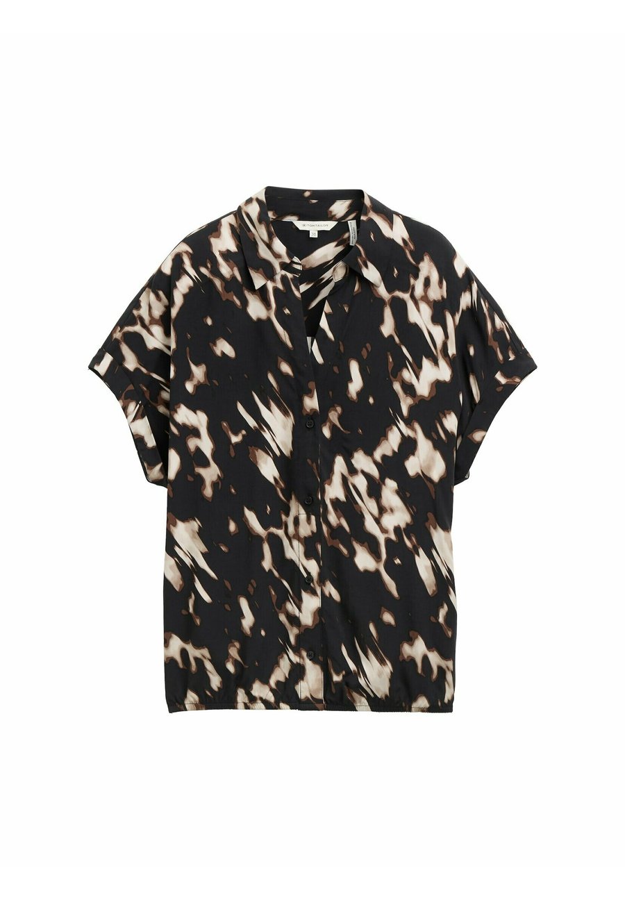 Блузка с узором из вискозы, с V-образным вырезом и воротником-стойкой. С эластичным поясом по низу и складками сзади. Вырез: V-образный. Воротник: Рубашечный. Застежка: Пуговица. Узор: Анималистический принт. Детали: Эластичный пояс. Материал и уход: 100% вискоза. Ткань: Сатин. Инструкции по уходу: Не отбеливать. Размер и посадка: Рост модели: 174 см, размер 34. Посадка: Свободная. Форма: Кокон. Длина: Стандартная. Длина рукава: Короткий. Общая длина: 63 см (размер 34).Доставка товаров осуществляется курьером или на пункт выдачи заказов.