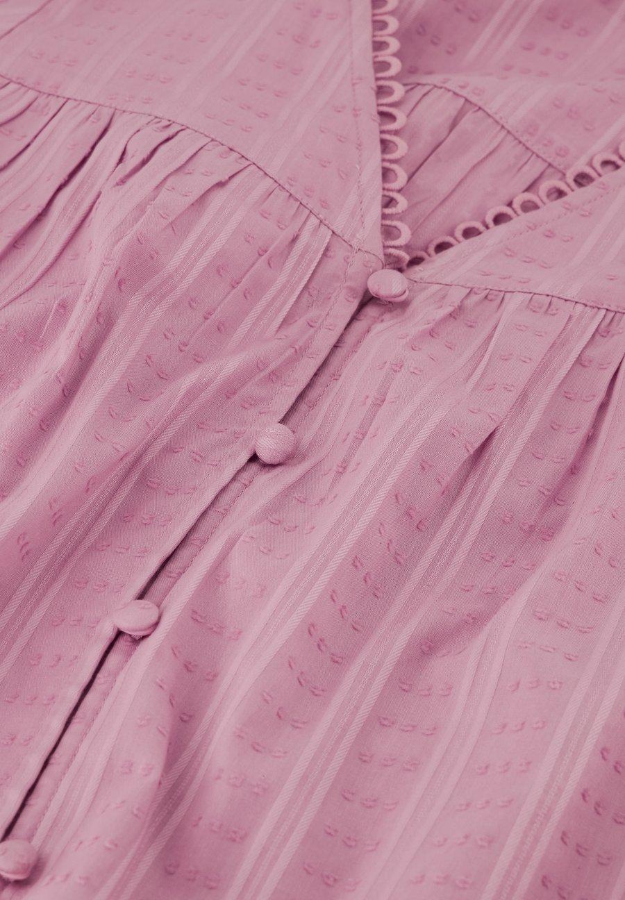 Эта свободная блузка нежно-розового цвета изготовлена из 100% хлопка и идеально подходит для солнечных дней. Игривые детали на рукавах и застежка на пуговицах спереди добавляют очарования. Легкая и универсальная летняя вещь. Вырез: V-образныйМатериал и уход