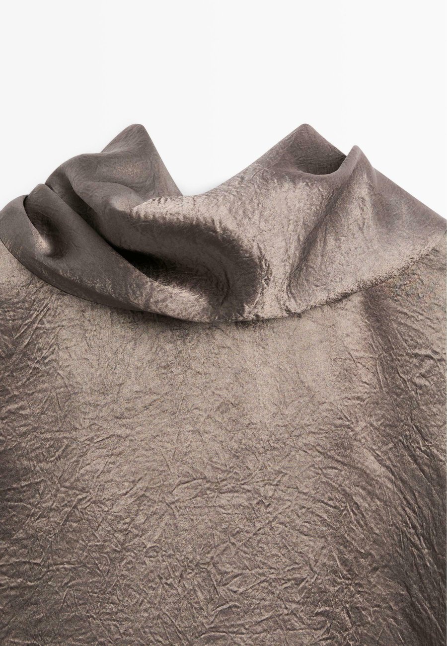 Атласная отделка. Длинные рукава. Струящаяся объемная блузка с воротником-стойкой. Эффект мятой ткани. Воротник: Шаль.Материал и уход