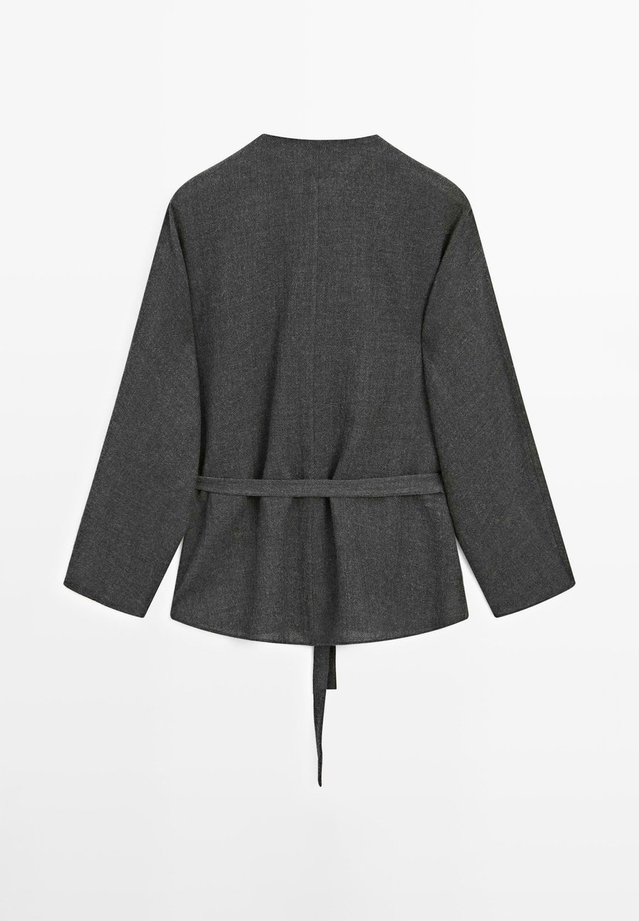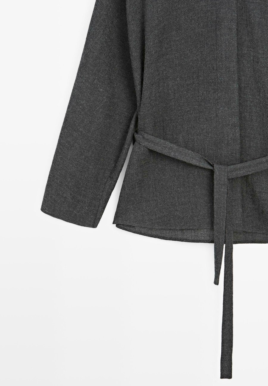 Пояс из той же ткани. Рубашка из шерстяной ткани. Застежка на пуговицы спереди, скрытая планкой. Круглый вырез. Рукава летучая мышь. Вырез: круглый.Материал и уход