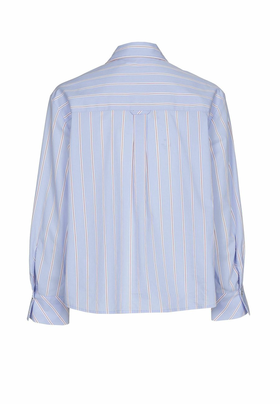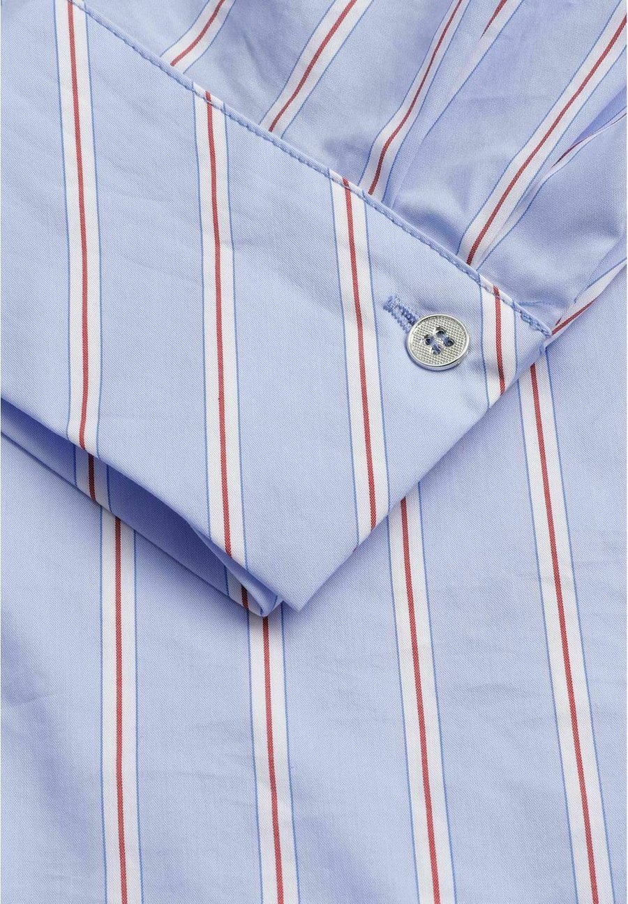 Эта блузка из 100% хлопка обеспечивает оптимальный комфорт и вневременную привлекательность. Светло-голубой дизайн с тонкой темно-красной полосой добавляет вашему образу изысканности и свежести. Благодаря прямому крою блузка приятная на ощупь и легко сочетается с другой одеждой. Идеально подходит как для повседневных, так и для более формальных образов. - Застежка на пуговицы - Прямой крой - 100% хлопок Вырез: V-образныйМатериал и уход