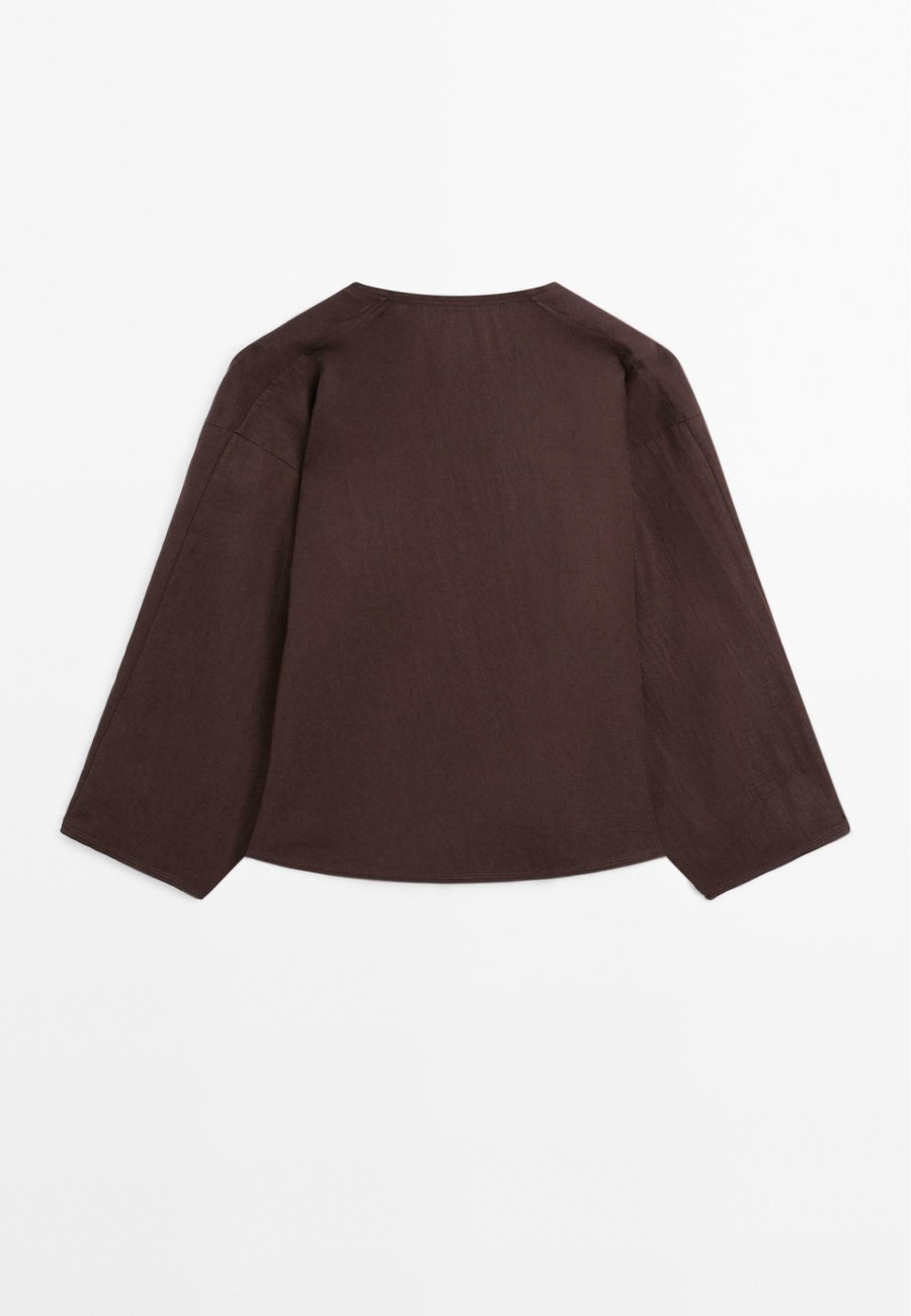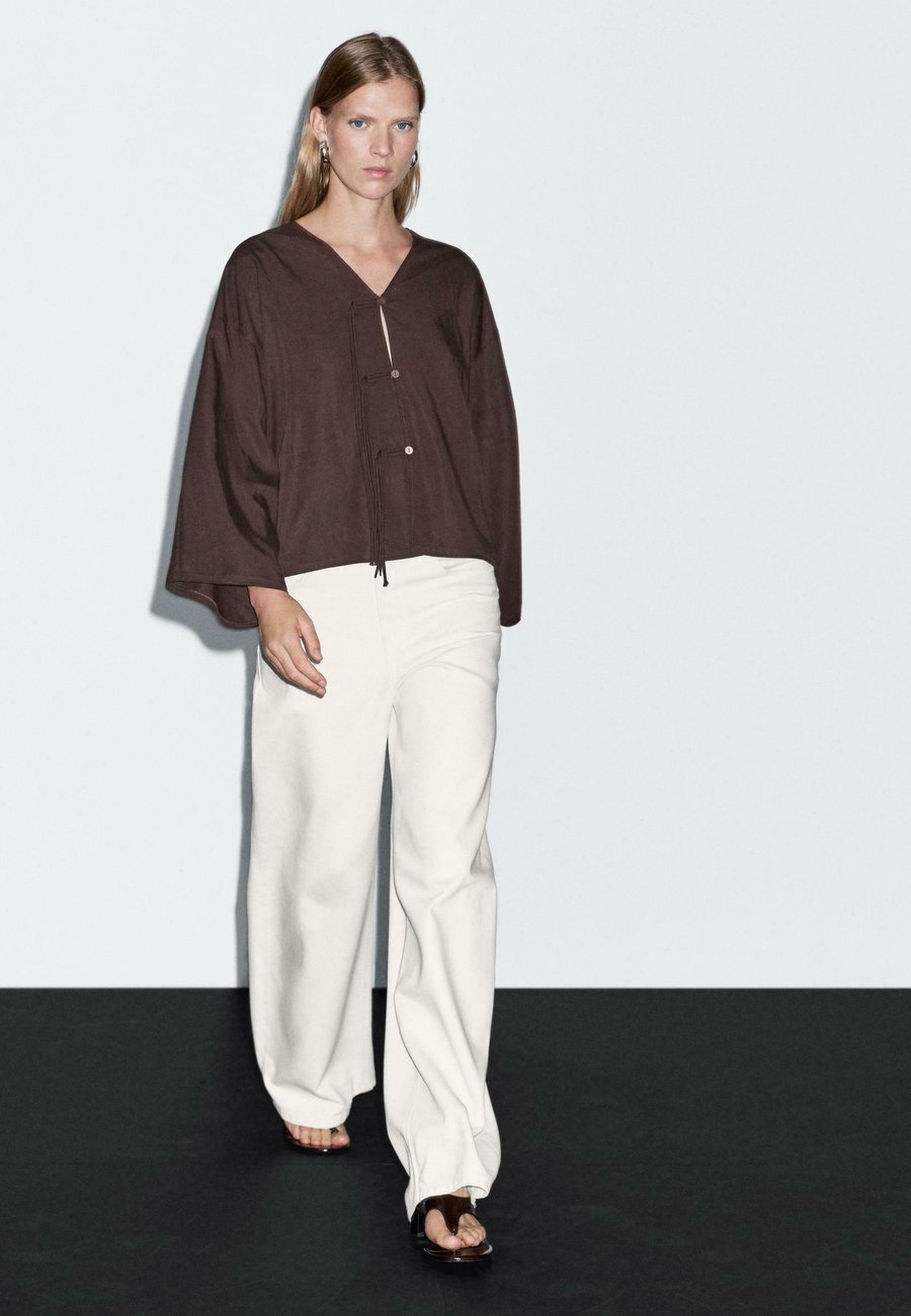 Широкие рукава. Широкий и свободный силуэт, не приталенный. Блузка с V-образным вырезом. Спущенные плечи. Застежка на пуговицы и кнопки с шнуровкой. Вырез горловины: Низкий V-образный вырезМатериал и уход