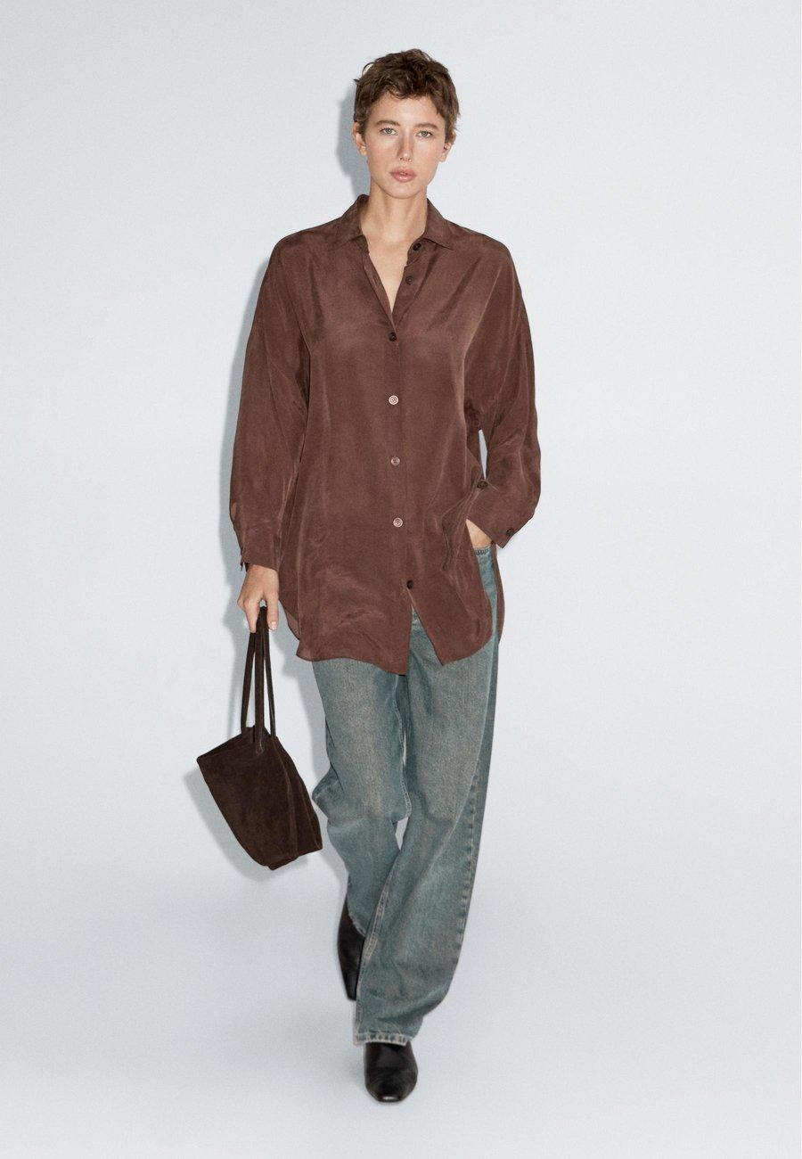 Широкий и свободный силуэт, не приталенный. Рубашечный воротник. Струящаяся рубашка. Застежка на пуговицы спереди. Рукава летучая мышь. Воротник: Рубашечный воротникМатериал и уход