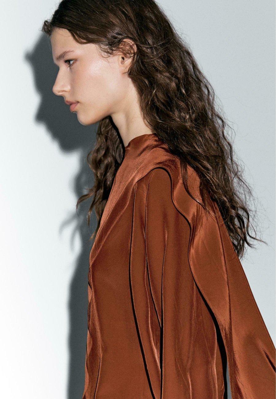 Струящаяся блузка с длинными рукавами. Воротник с завязкой в виде многофункциональной шали. Отделка с эффектом мятости. Вырез горловины: круглый.Материал и уход