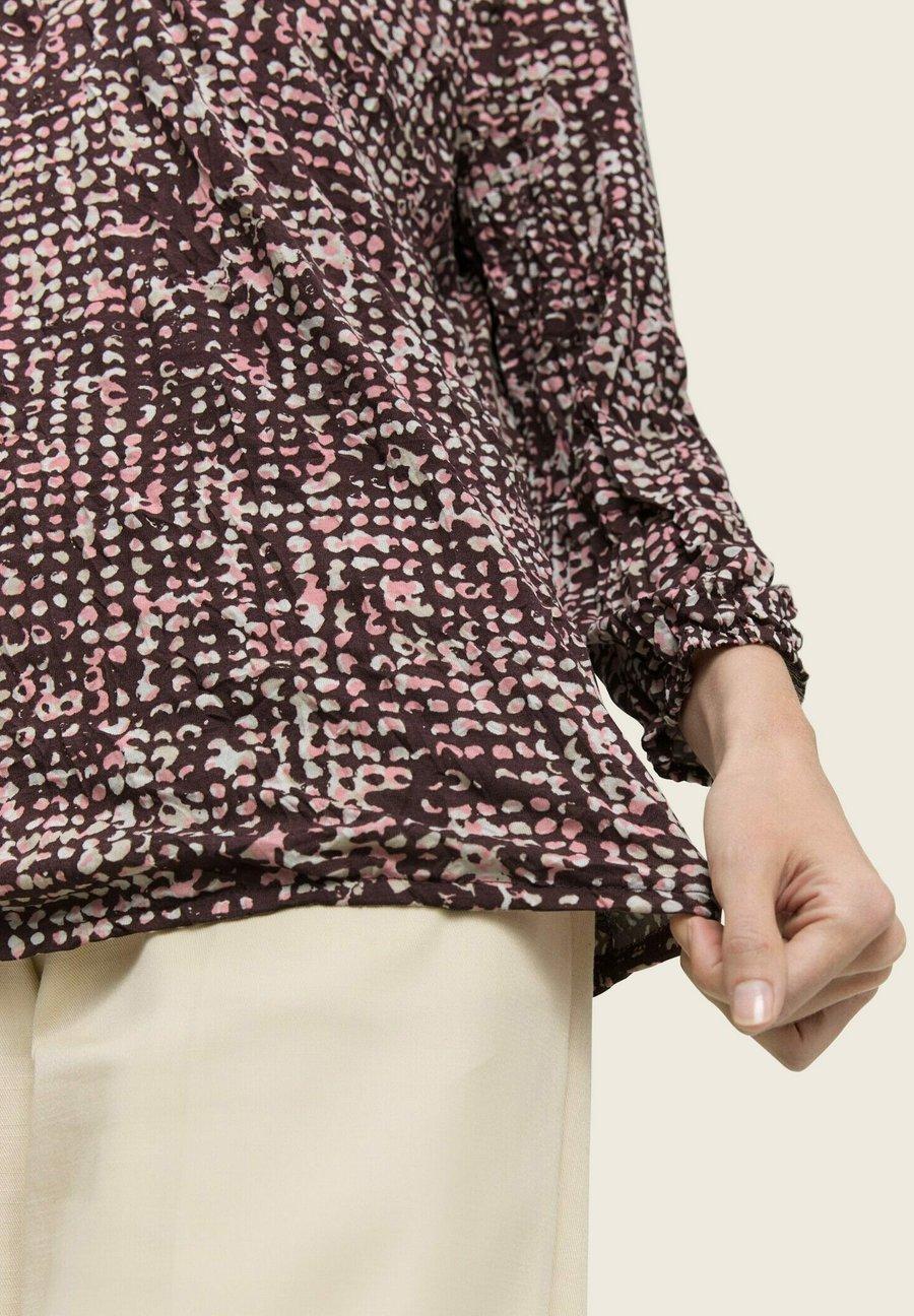 Рубашка с рукавами 3/4 и узором, выполненная в мятой ткани. С эластичным поясом по низу и пуговицей на вырезе горловины. Изготовлена из однослойного трикотажа. Вырез горловины: Низкий V-образный вырезМатериал и уход