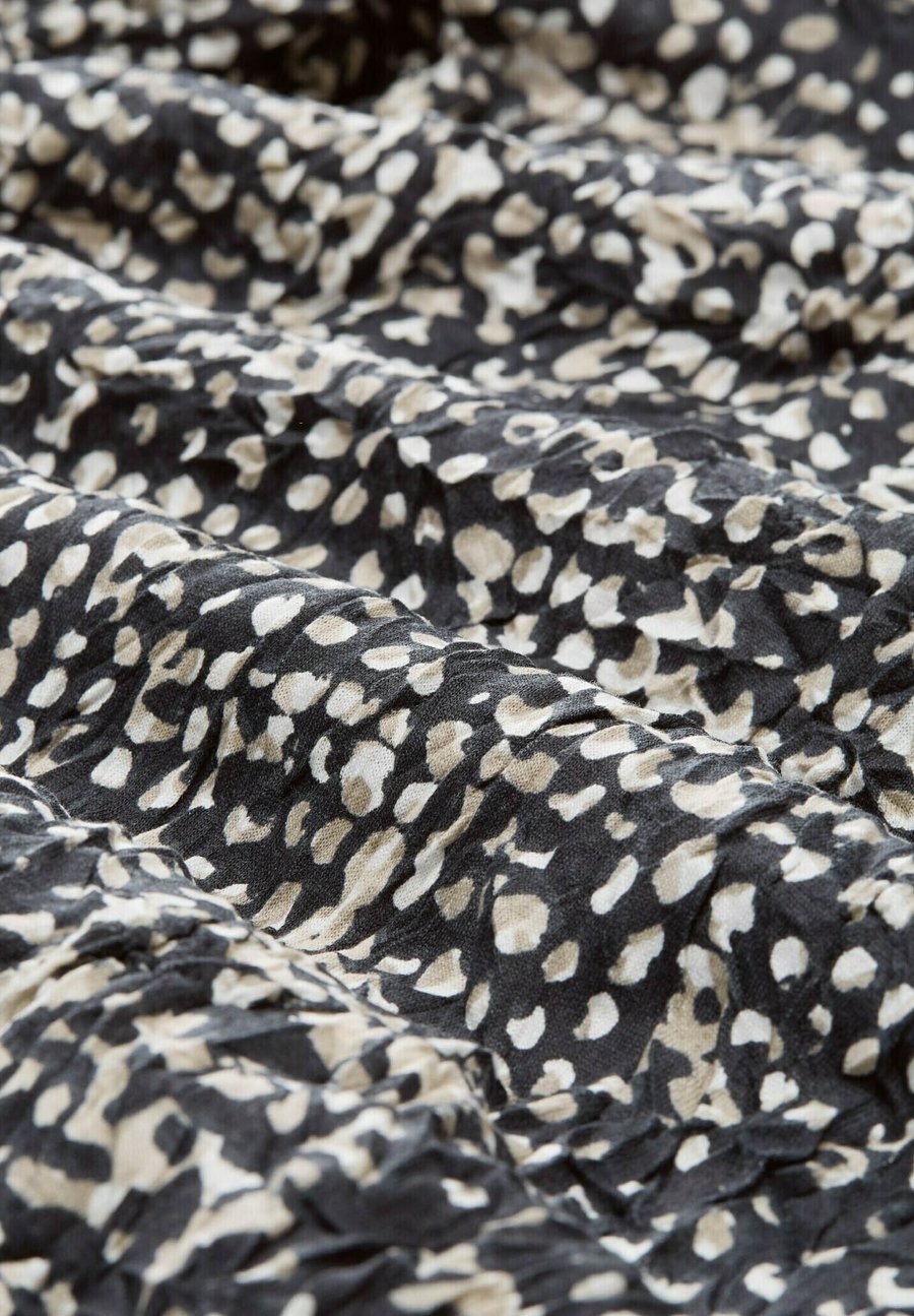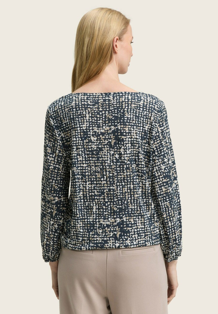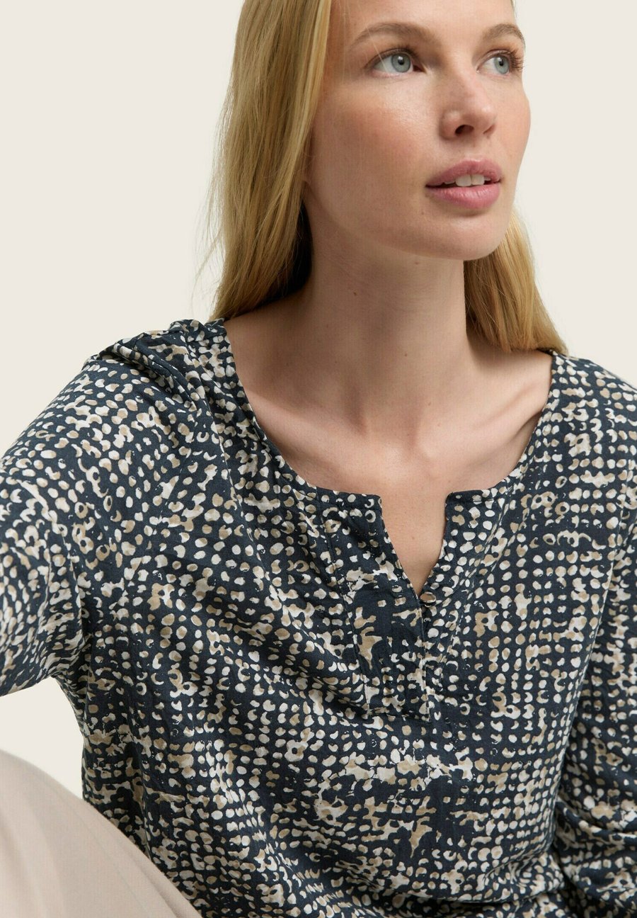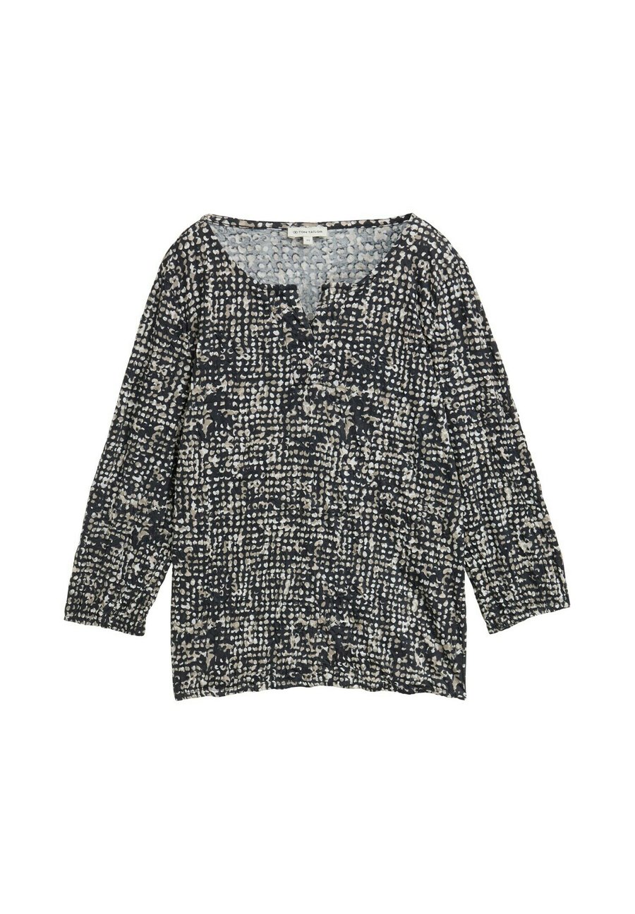 Рубашка с рукавами 3/4 и узором, выполненная в мятой ткани. С эластичным поясом по низу и пуговицей у выреза горловины. Изготовлено из однослойного трикотажа. Вырез горловины: Низкий V-образный вырезМатериал и уход