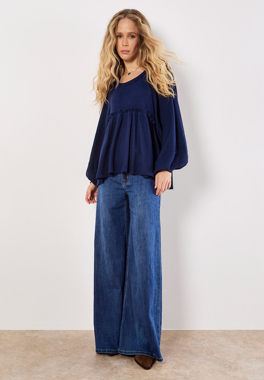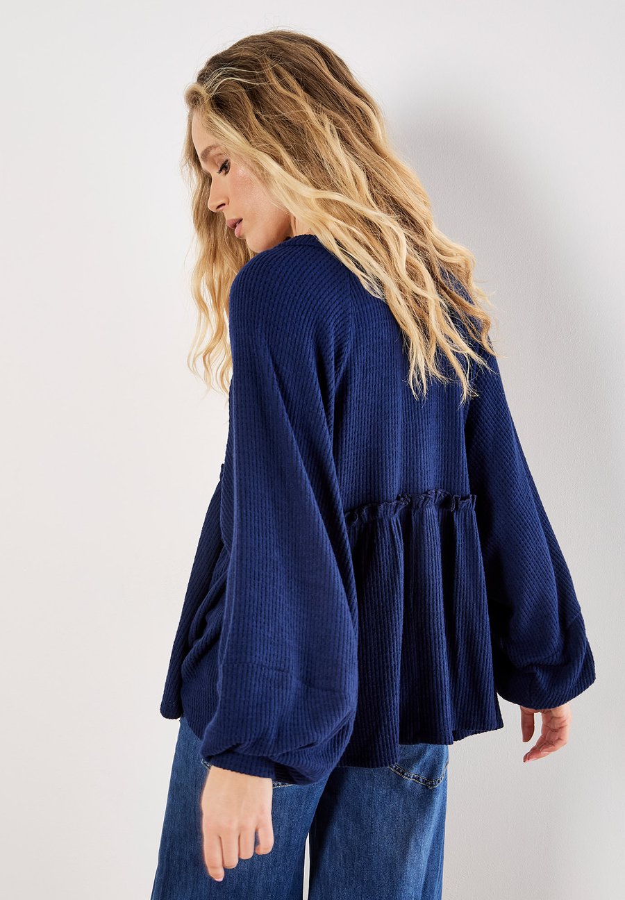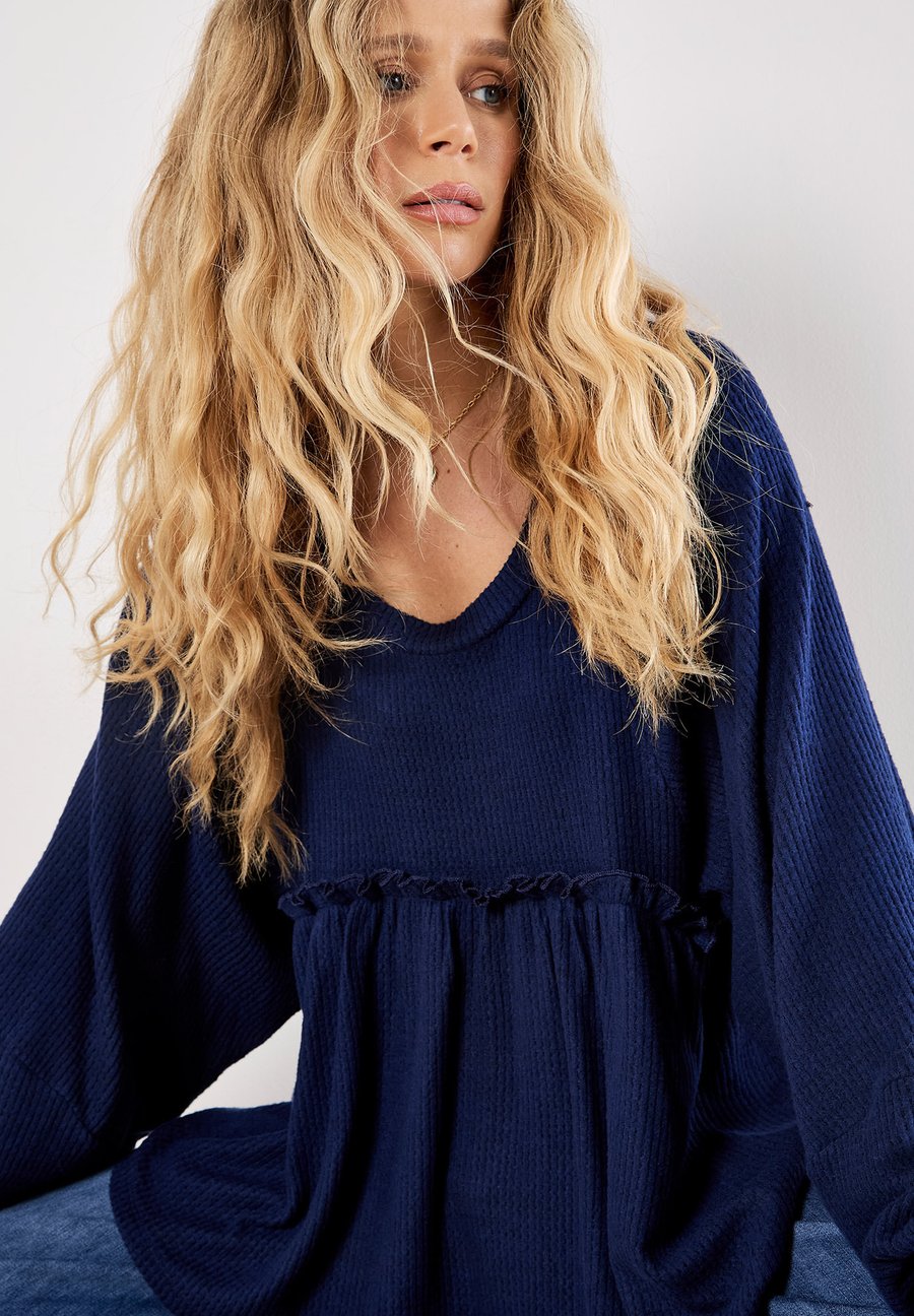Этот топ, выполненный из очень мягкой вафельной вязки, создан для уютных и повседневных дней. Платье с круглым вырезом и объемными рукавами имеет свободный крой и подол в стиле бэбидолл с оборками. Вырез: КруглыйМатериал и уход