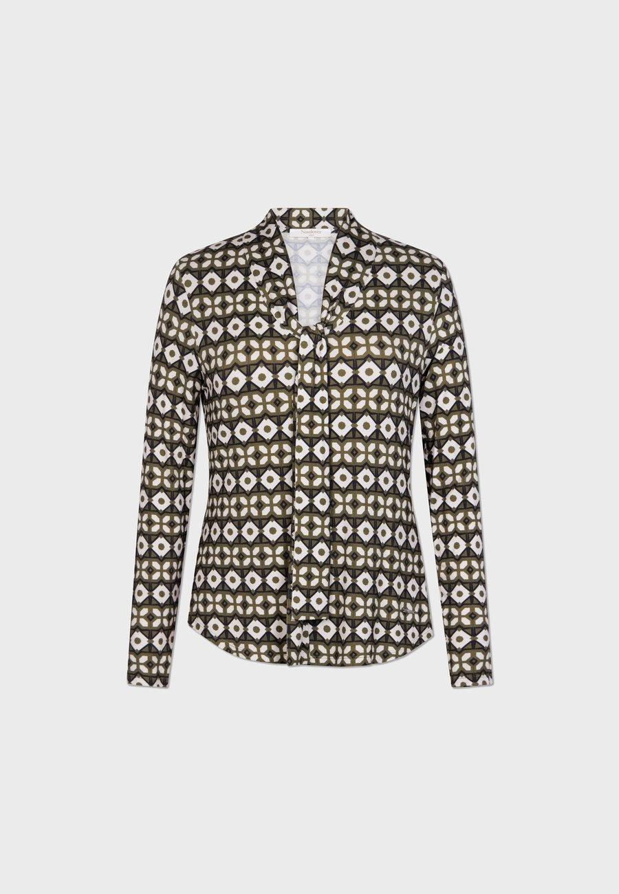 Свободный топ из эластичного трикотажа с элегантным геометрическим принтом и завязкой на вырезе горловины. Дизайн, отделка, сборка, стежка и ткачество: Испания. Вырез горловины: V-образный. Воротник: Шаль. Застежка: Шнуровка. Узор: Принт. Детали: Бант. Материал и уход: 97% вискоза, 3% эластан. Инструкции по уходу: Только ручная стирка, химчистка. Размер и посадка: Рост модели: 180 см, размер 42. Посадка: Обычная. Форма: Прямая. Длина: Стандартная. Длина рукава: Длинный. Длина рукава: 58 см (размер 42). Ширина спинки: 36 см. (Размер 42)Доставка товаров осуществляется курьером или на пункт выдачи заказов.