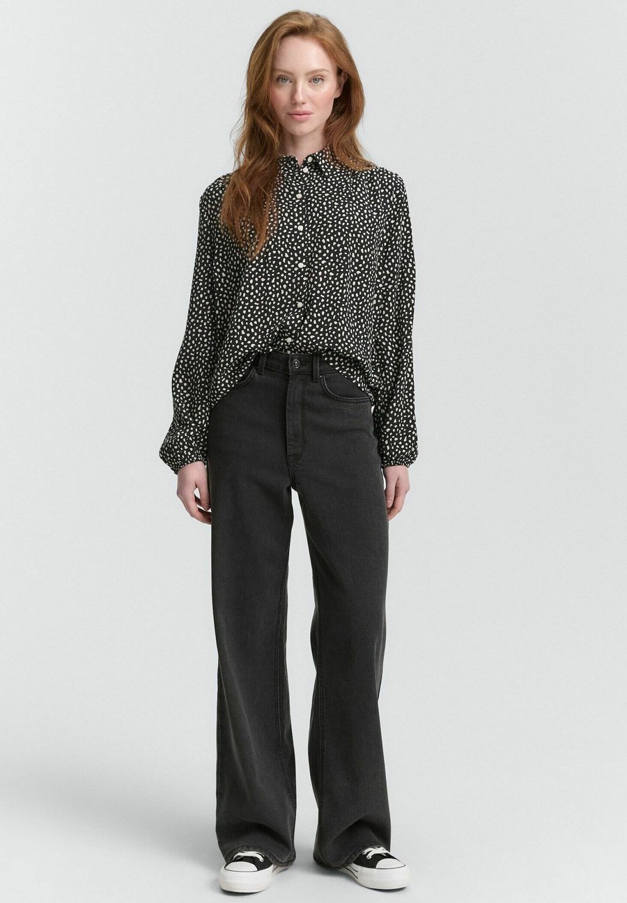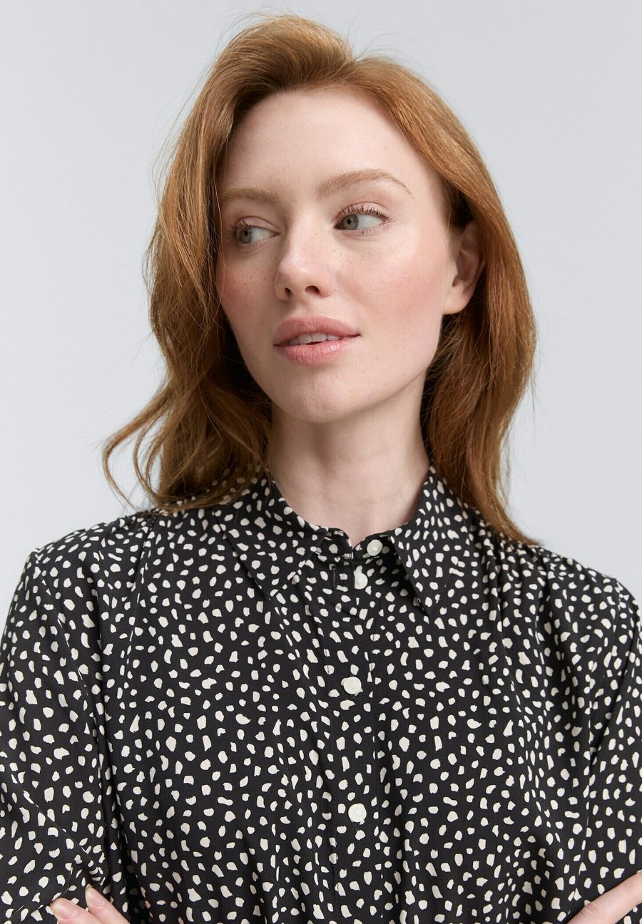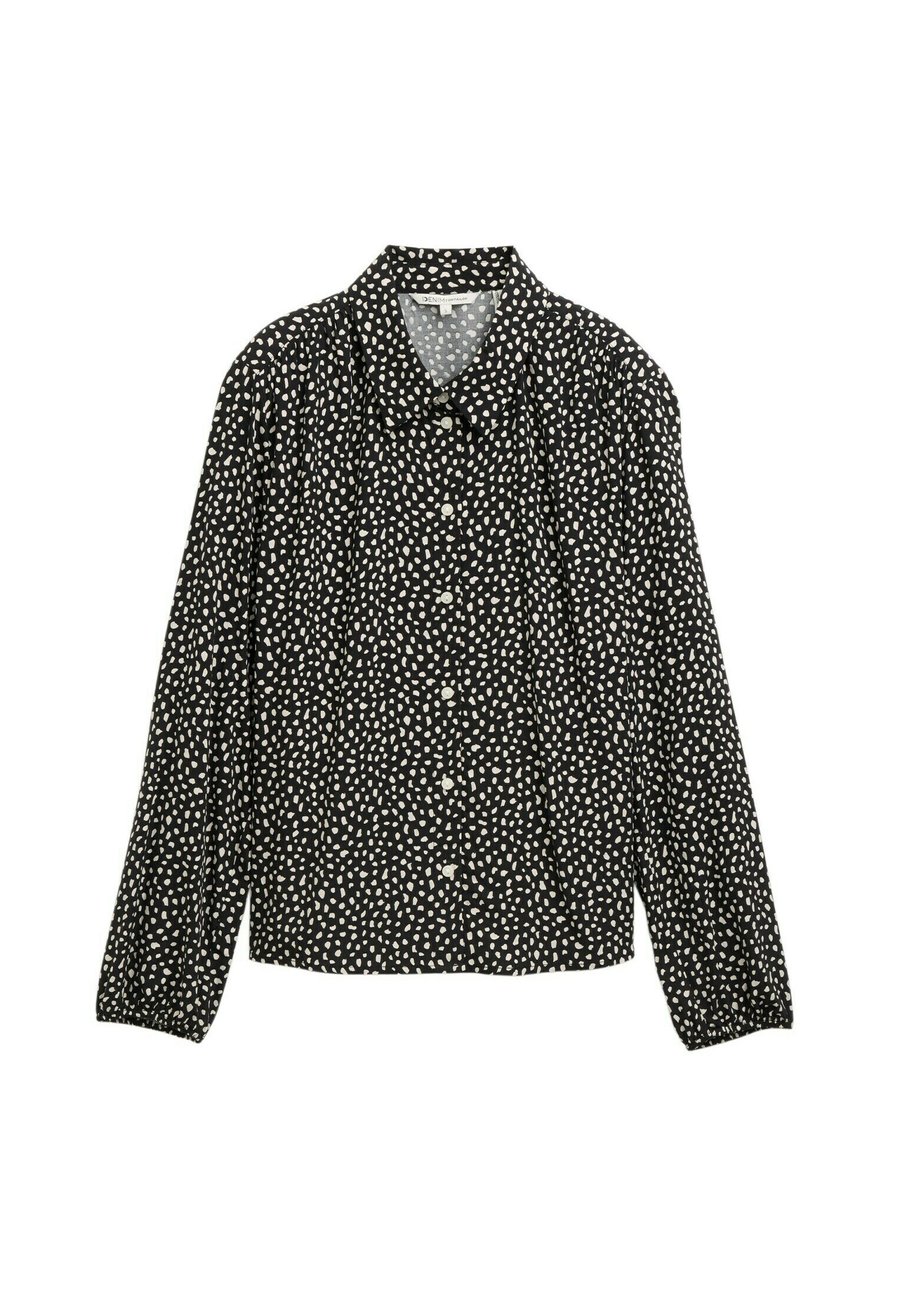 Блузка-рубашка с узором из вискозы с эластичным поясом по низу рукава. Воротник: Рубашечный. Застежка: Пуговица. Узор: Принт.Материал и уход