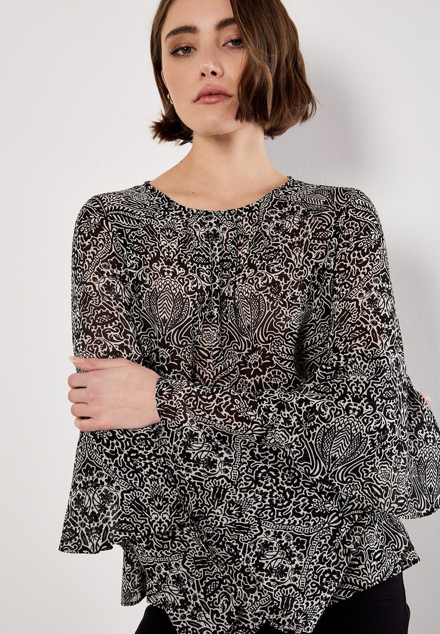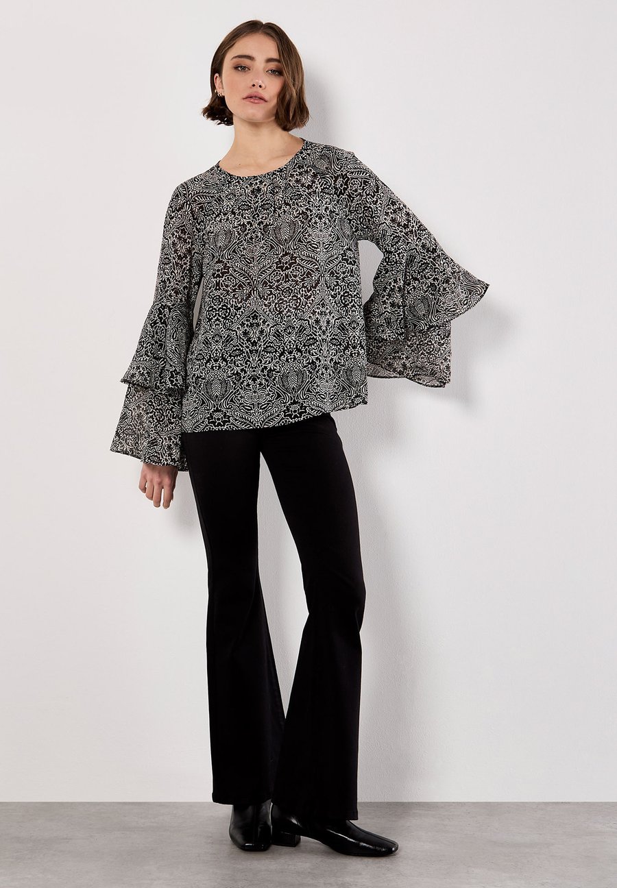 Откройте для себя стиль бохо-шик с этой блузкой с узором пейсли. Легкая и тканая, эта модель имеет облегающий силуэт, круглый вырез горловины и широкие рукава с оборками. Вырез горловины: Круглый вырезМатериал и уход