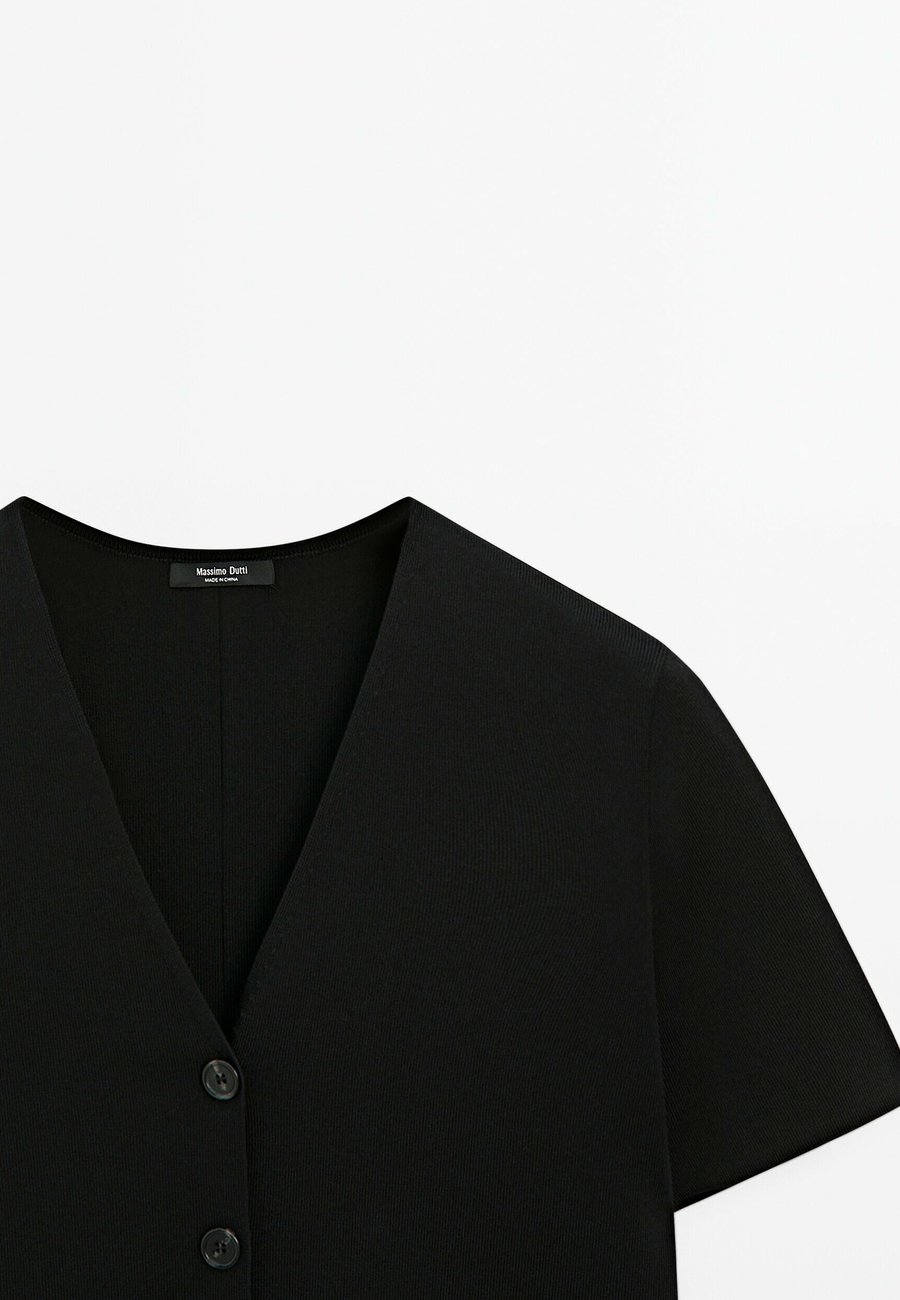 V-образный вырез. Короткие рукава. Вязаный кардиган. Застежка на пуговицы спереди. Вырез горловины: глубокий V-образный.Материал и уход