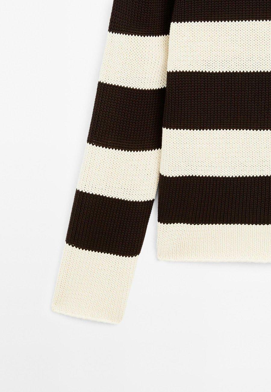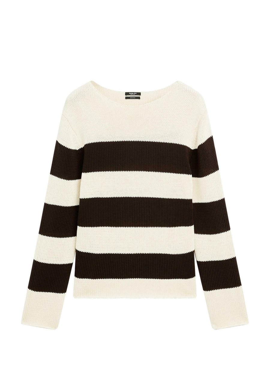 Широкий и свободный силуэт, не приталенный. Полосатая отделка. Круглый вырез. Длинные рукава. Вязаный джемпер из 100% хлопка. Вырез горловины: лодочка.Материал и уход