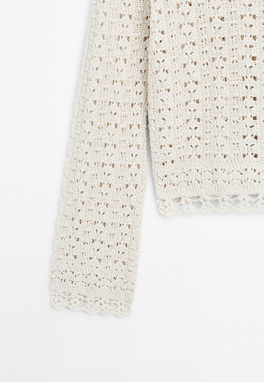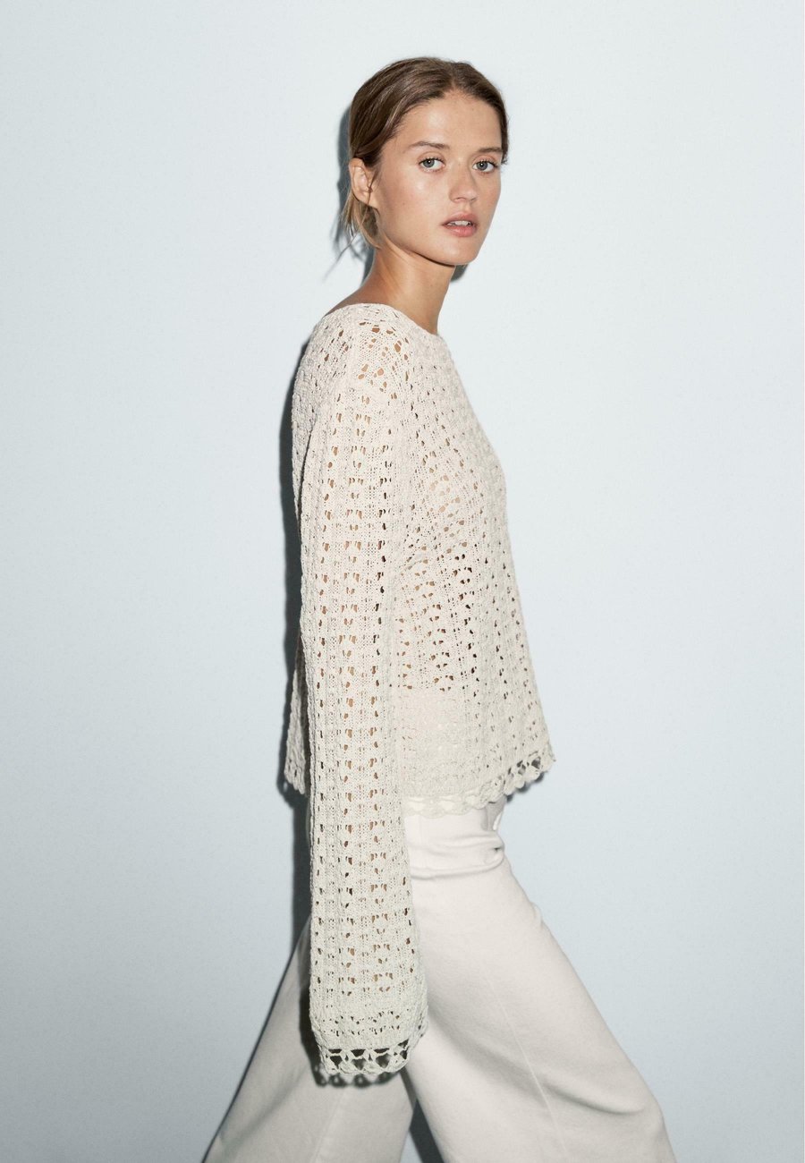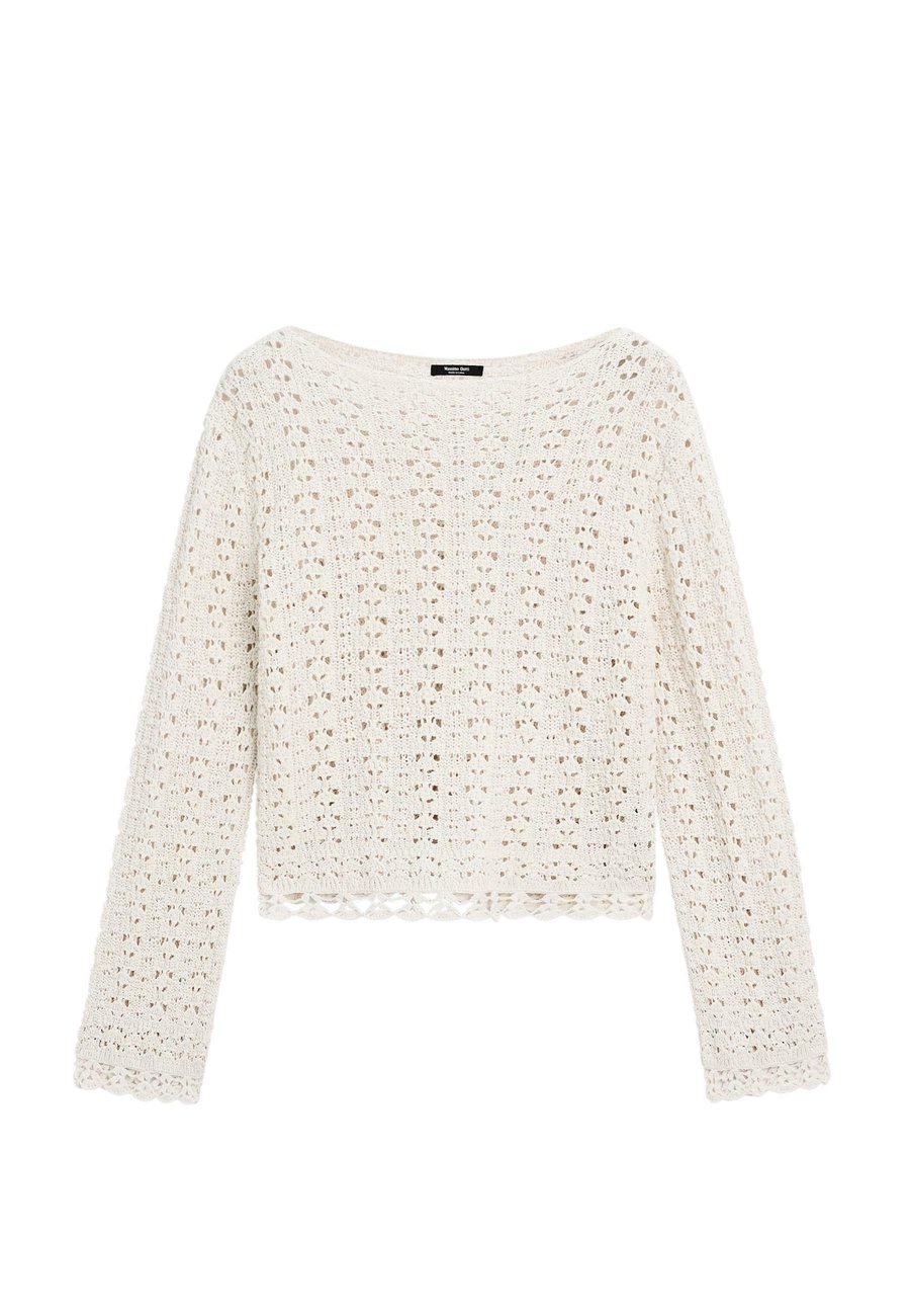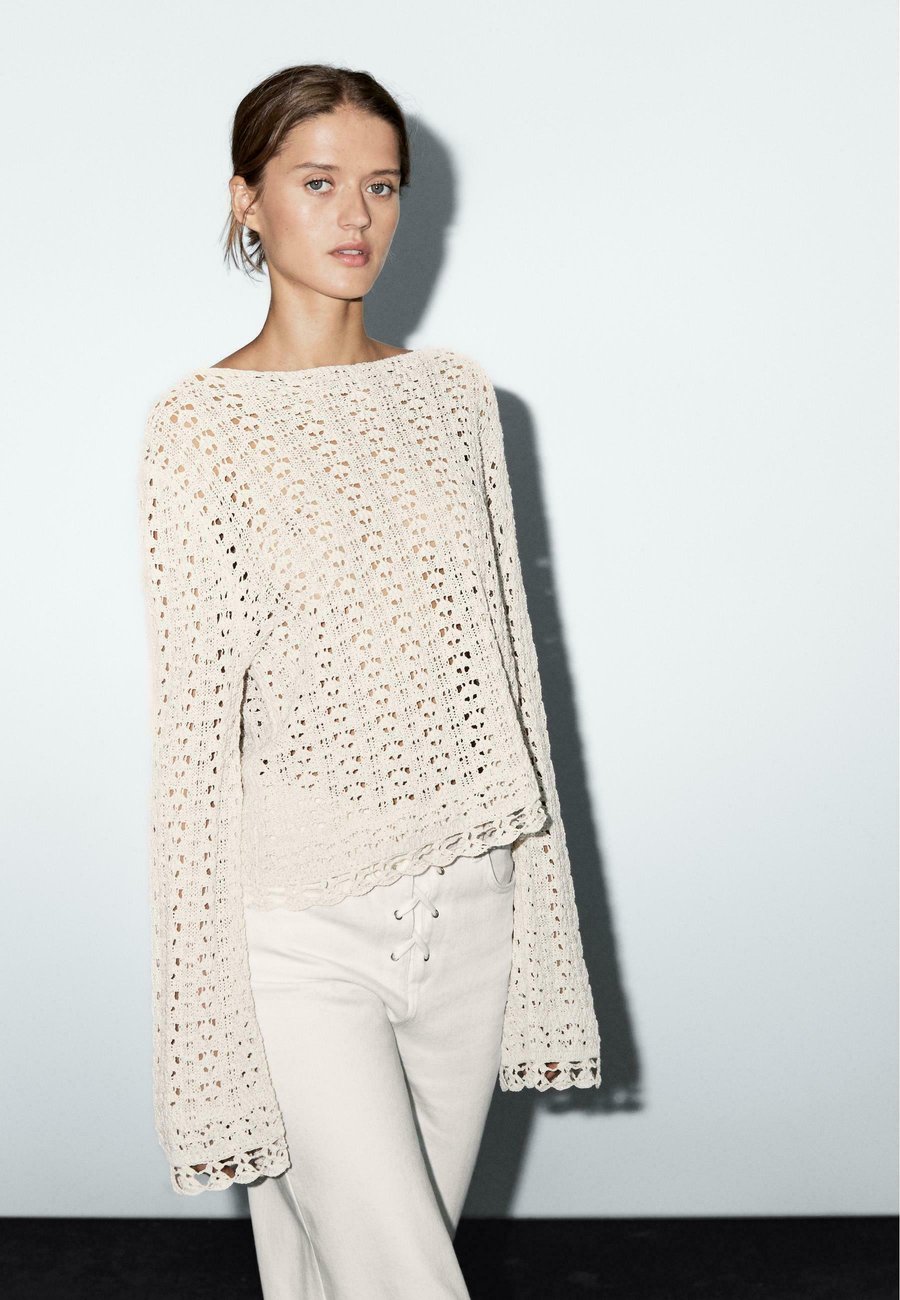 Широкий и свободный силуэт, не приталенный. Круглый вырез. Ажурная ткань. Длинные расклешенные рукава. Вязаный свитер из смесовой хлопковой ткани. Вырез горловины: Лодочка.Материал и уход