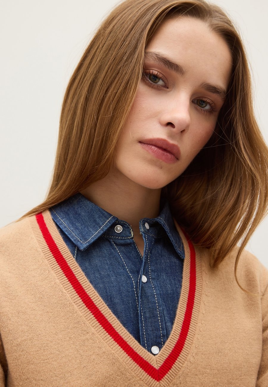 Бежевый пуловер из чистой шерсти из коллекции PIOMBO идеально подходит для того, чтобы согреться и почувствовать себя комфортно в холодные зимние дни. Модель отличается глубоким V-образным вырезом и изысканной красной отделкой, которая подчеркивает эстетику изделия. Длинные рукава и стандартный крой обеспечивают оптимальный комфорт. Вырез горловины: Низкий V-образный вырезМатериал и уход