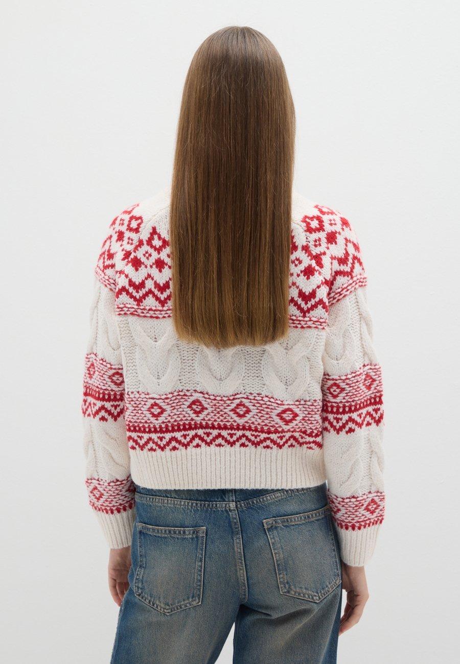 Белый джемпер из коллекции B.Angel отличается уникальным красным жаккардовым узором, что делает его выдающимся изделием. Классический крой и круглый вырез горловины обеспечивают комфорт при повседневной носке. Вырез горловины: круглыйМатериал и уход