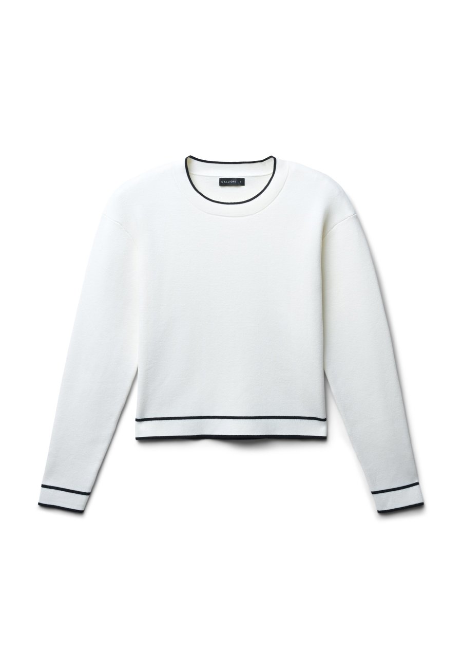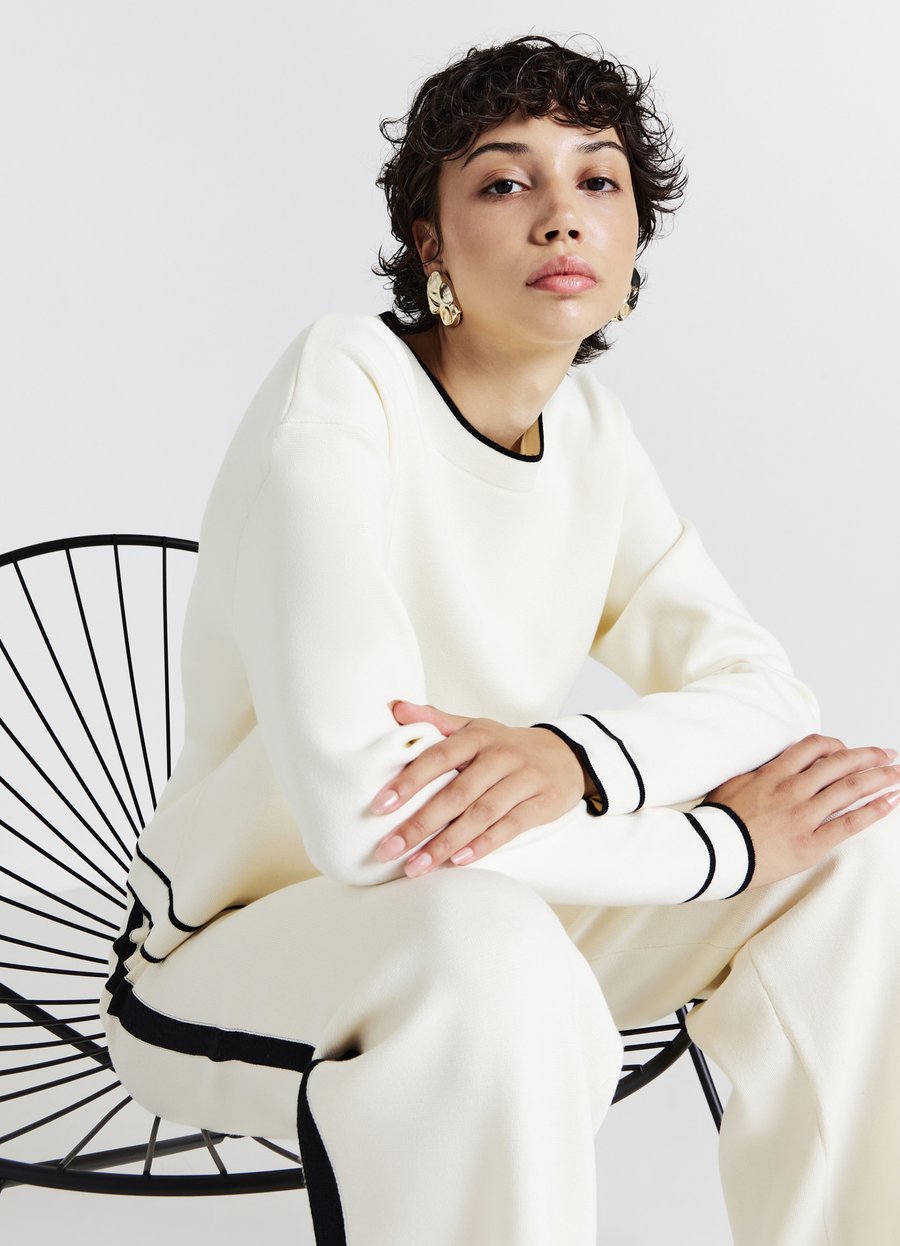 Женский свитер с круглым вырезом и длинными рукавами, отличающийся контрастной отделкой горловины, манжет и нижнего края. Простой и изысканный дизайн делает его идеальным для офисных мероприятий, сочетается с элегантными брюками или юбками. Рост модели 1,78 м, размер S. Вырез горловины: круглый.Материал и уход