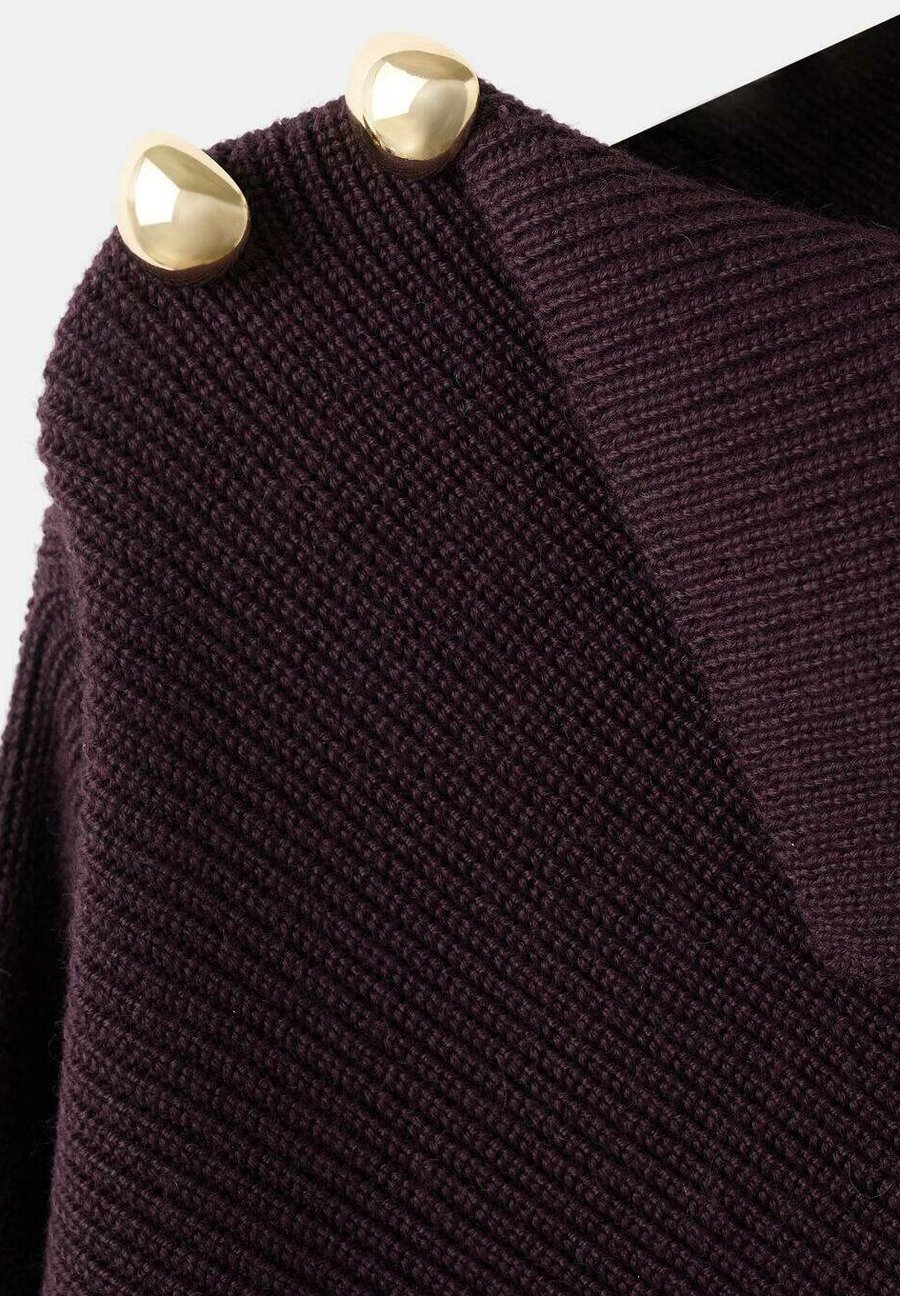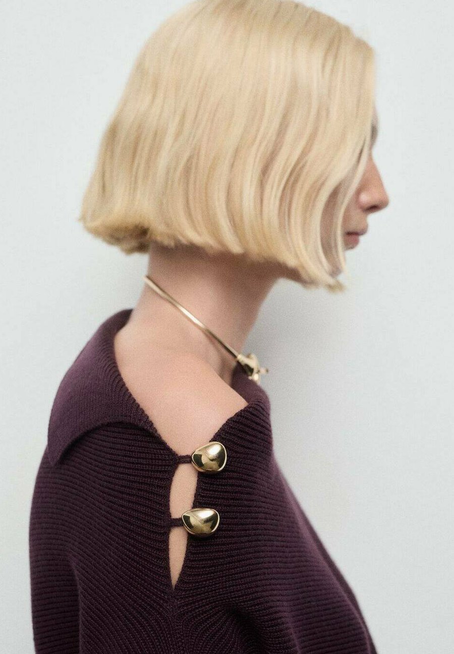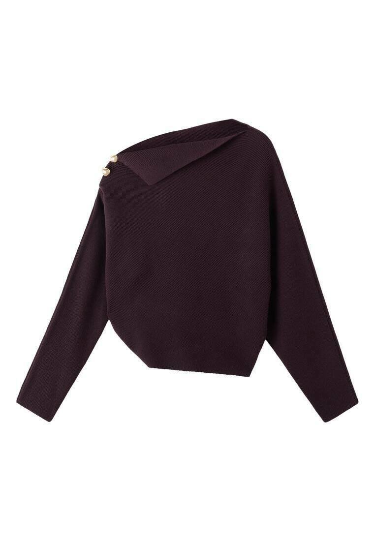 Трикотажная ткань, прямой крой, асимметричный воротник, длинный рукав, пуговицы в области плеча, пуговицы с эффектом драгоценных камней. Вырез горловины: Воротник-хомут.Материал и уход